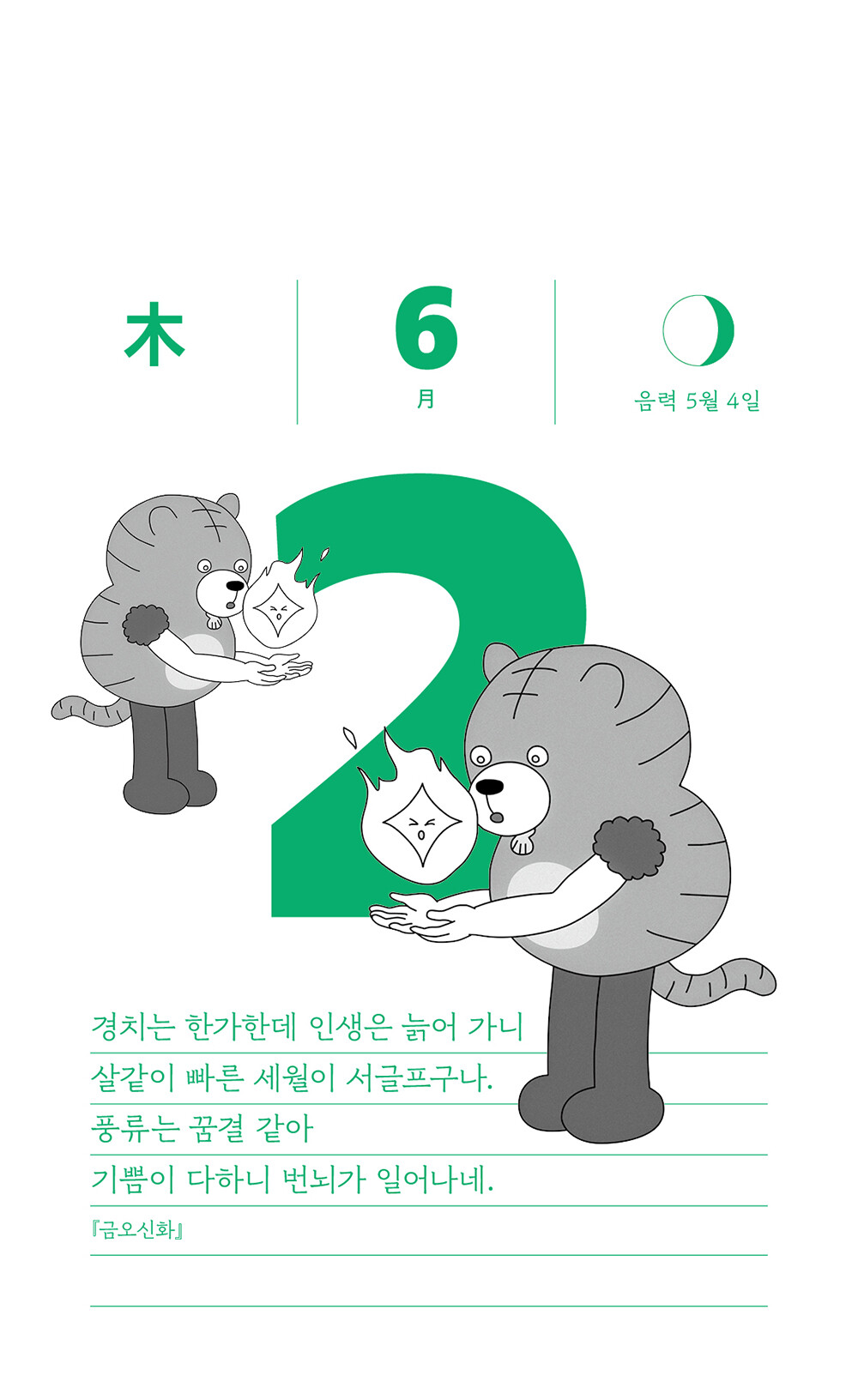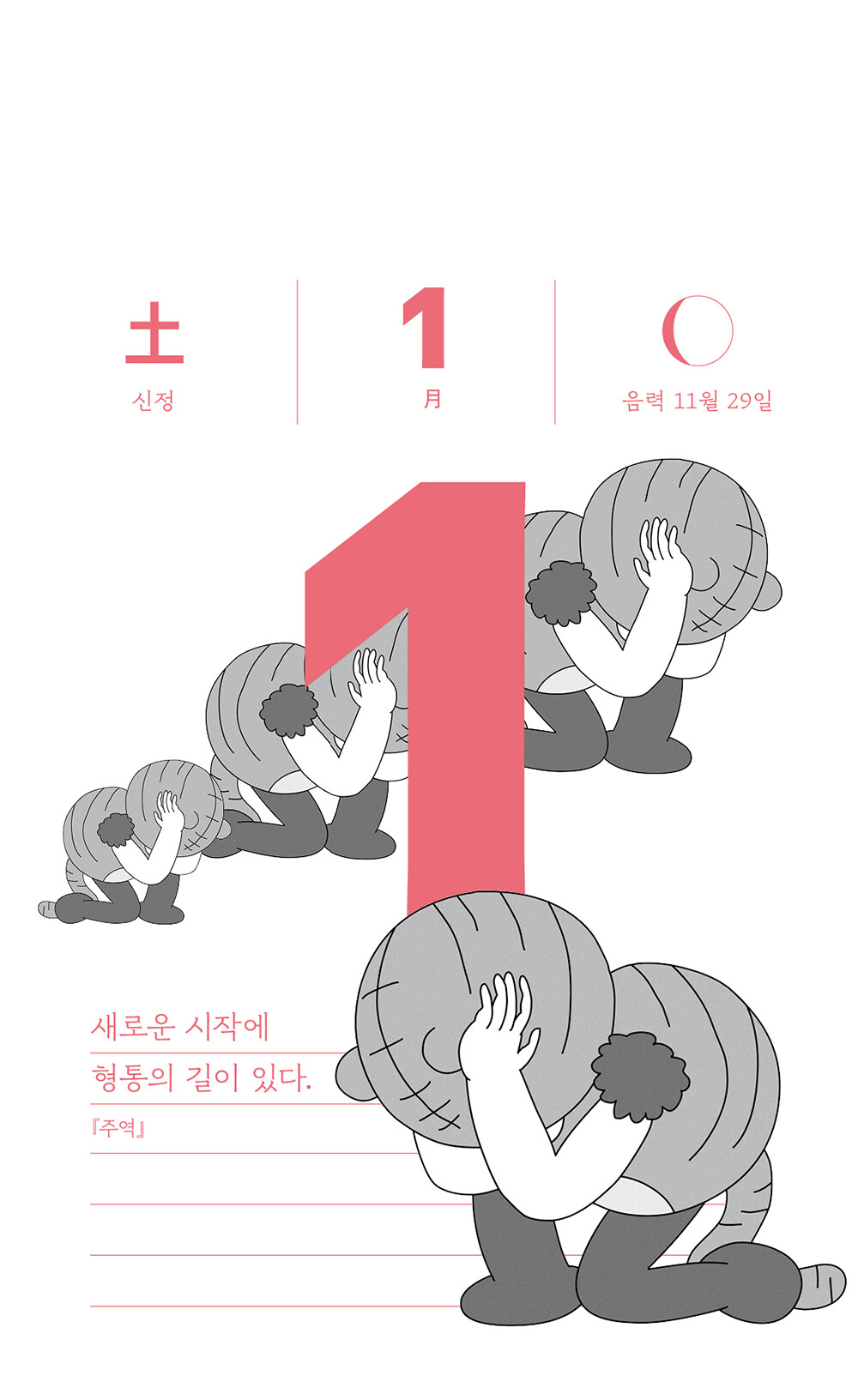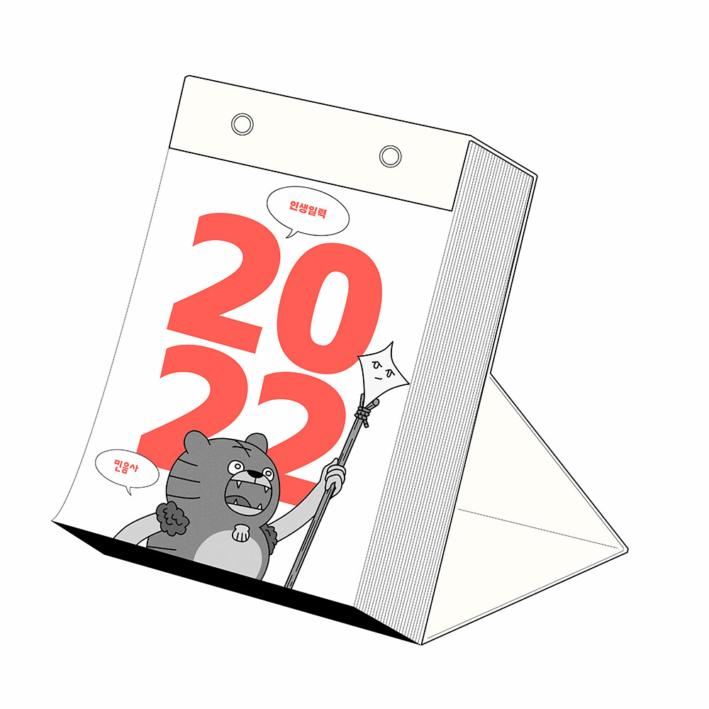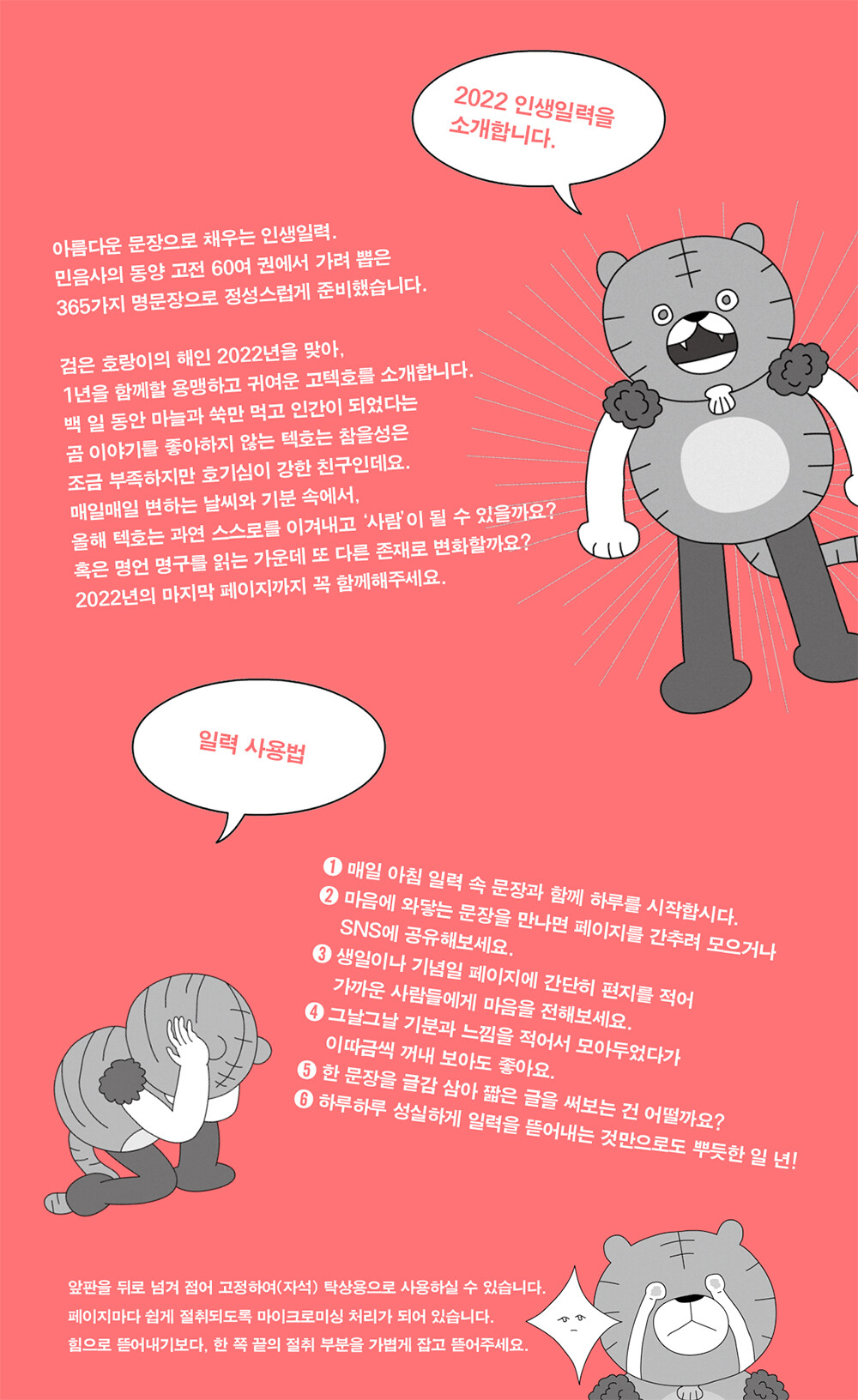 검은 호랑이의 해인 2022년을 맞아, 1년을 함께할 용맹하고 귀여운 고텍호를 소개합니다. 백 일 동안 마늘과 쑥만 먹고 인간이 되었다는 곰 이야기를 좋아하지 않는 텍호는 참을성은 조금 부족하지만 호기심이 강한 친구인데요. 매일매일 변하는 날씨와 기분 속에서, 올해 텍호는 과연 스스로를 이겨내고 ‘사람’이 될 수 있을까요? 혹은 명언 명구를 읽는 가운데 또 다른 존재로 변화할까요? 2022년의 마지막 페이지까지 꼭 함께해주세요.