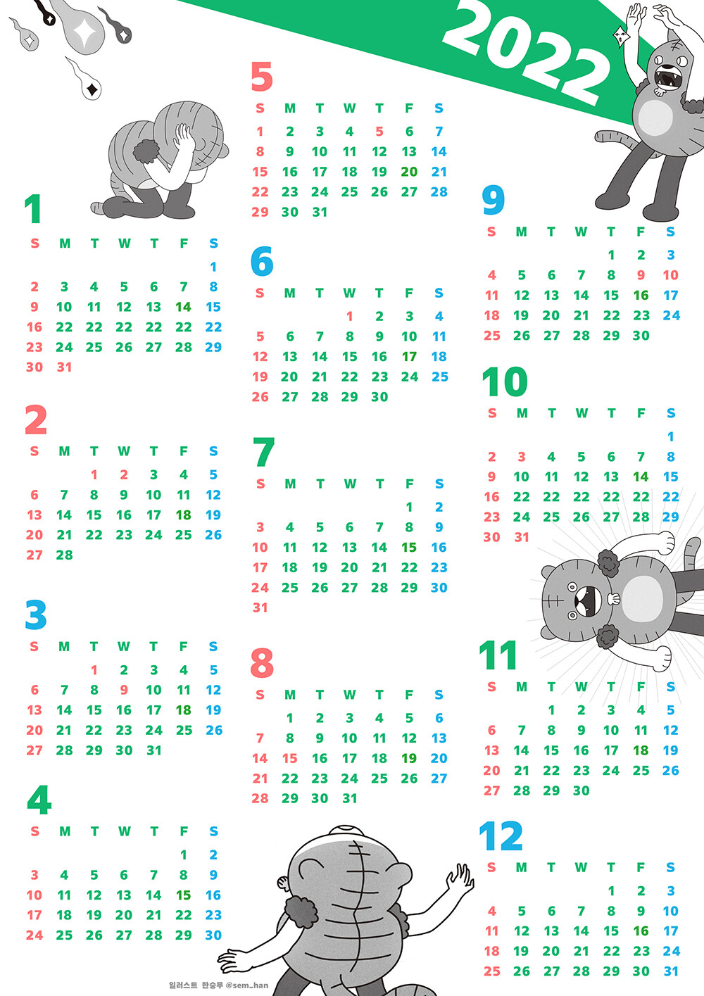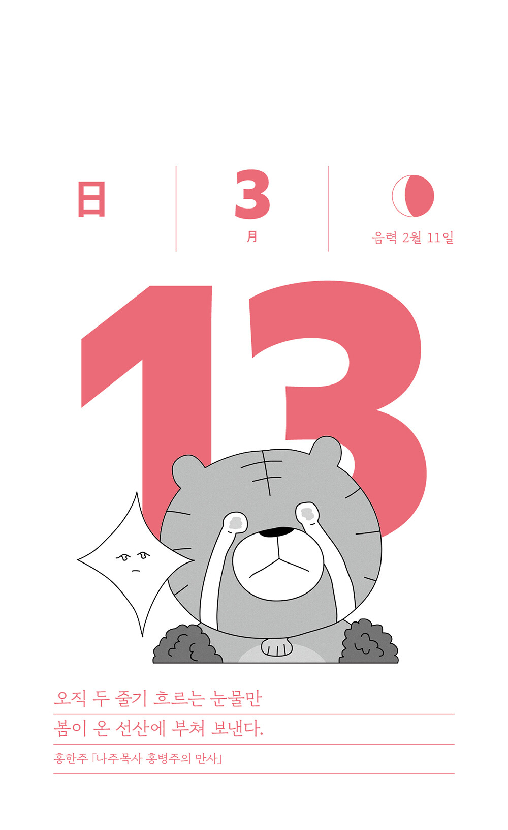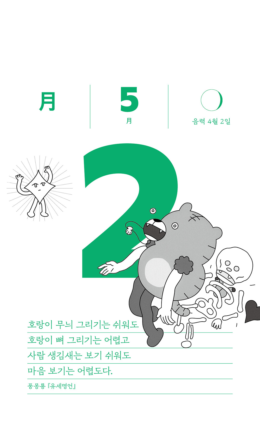 검은 호랑이의 해인 2022년을 맞아, 1년을 함께할 용맹하고 귀여운 고텍호를 소개합니다. 백 일 동안 마늘과 쑥만 먹고 인간이 되었다는 곰 이야기를 좋아하지 않는 텍호는 참을성은 조금 부족하지만 호기심이 강한 친구인데요. 매일매일 변하는 날씨와 기분 속에서, 올해 텍호는 과연 스스로를 이겨내고 ‘사람’이 될 수 있을까요? 혹은 명언 명구를 읽는 가운데 또 다른 존재로 변화할까요? 2022년의 마지막 페이지까지 꼭 함께해주세요.