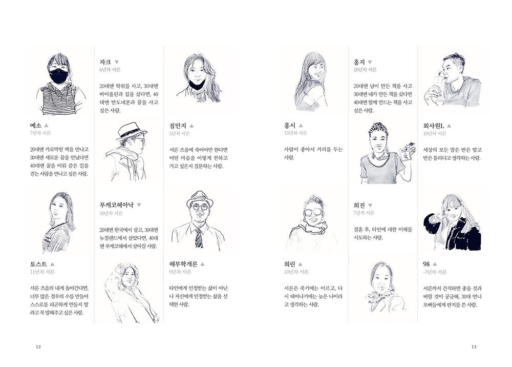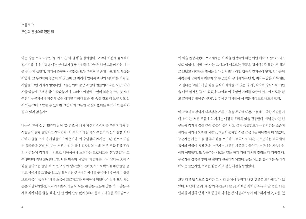 이 책을 완성시켰다. 우리에게는 이 책을 완성해야 하는 어떤 계약 조건이나 시스 템도 없었다. 기획자인 나는 그때그때 떠오르는 질문을 정리해 3주에 한 번 메일로 보냈고 사람들은 진심을 담아 답장했다. 어떤 형태의 결과물이 될지, 얼마큼의 사람들이 끝까지 함께할지 알 수 없었다. 우리에게는 단지, 지나온 삶을 기록해보고 싶다는 ‘마음’, 지난 삶을 솔직히 바라볼 수 있는 ‘용기’, 각자의 방식으로 최선을 다해 살아온 ‘삶’이 있었다. 그리고 이 우연한 기회를 소중히 여기며 서로를 믿고 끝까지 함께해 준 ‘신뢰’. 결국 이런 가치들이 이 책을 세상으로 나오게 했다. - 프롤로그 – p5