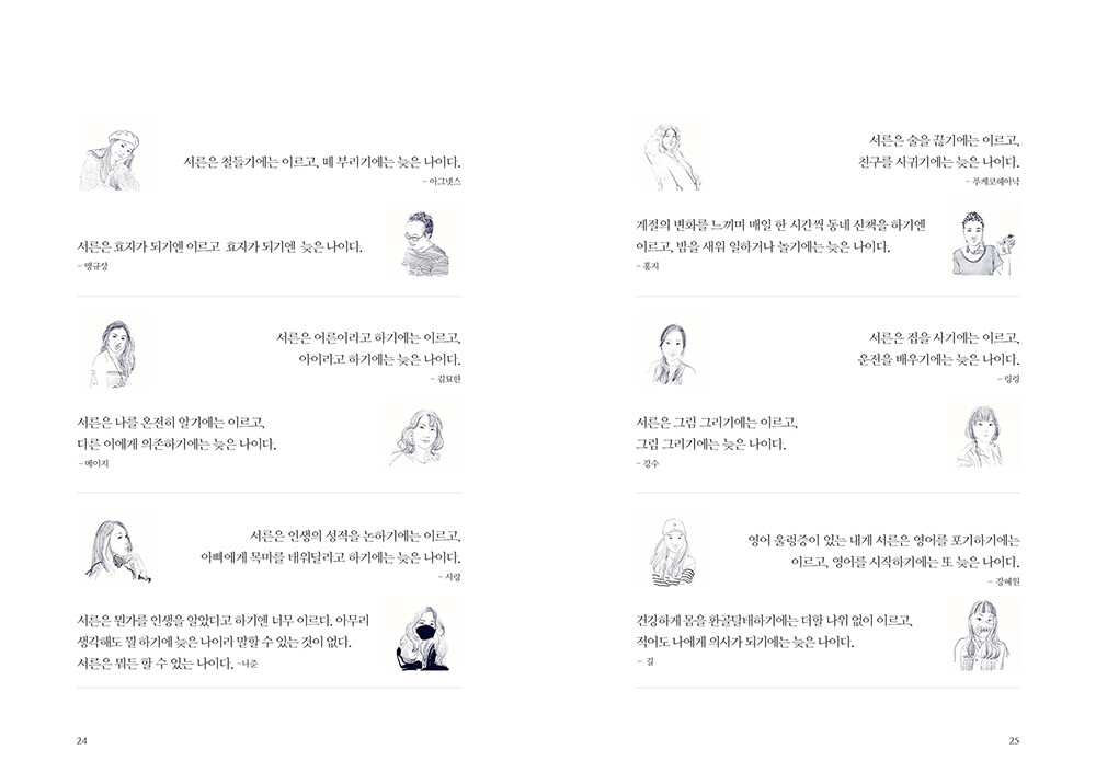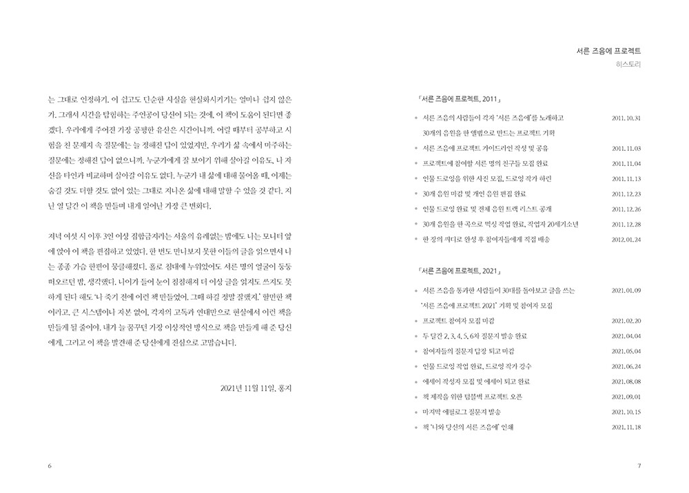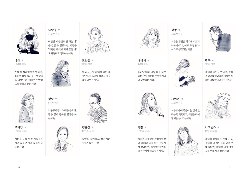 서른 즈음에 회사를 그만둔 10년차 프리랜서와 10년째 같은 회사로 출근하는 직장인의 삶, 한국을 떠나 새로운 곳에 정착한 이민자의 삶과 한 동네를 떠나본 적 없는 붙박이 주민의 삶, 서른이 지나 누군가는 새로운 가족을 만났고, 누군가는 오래된 사랑과 헤어졌습니다. 뒤늦게 꿈을 펼쳐나가는 이의 글 뒤에는 일찍 꿈을 접어야 했던 이의 이야기가 있습니다.
