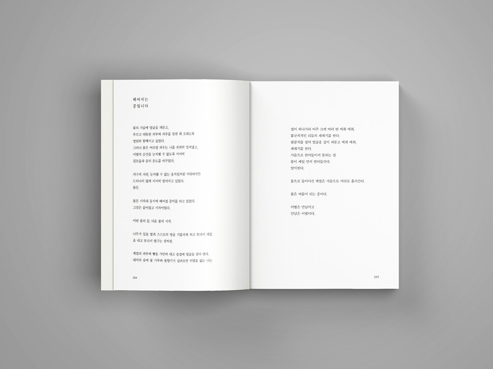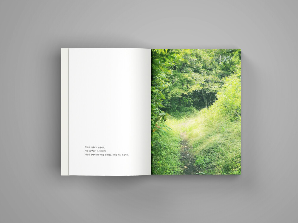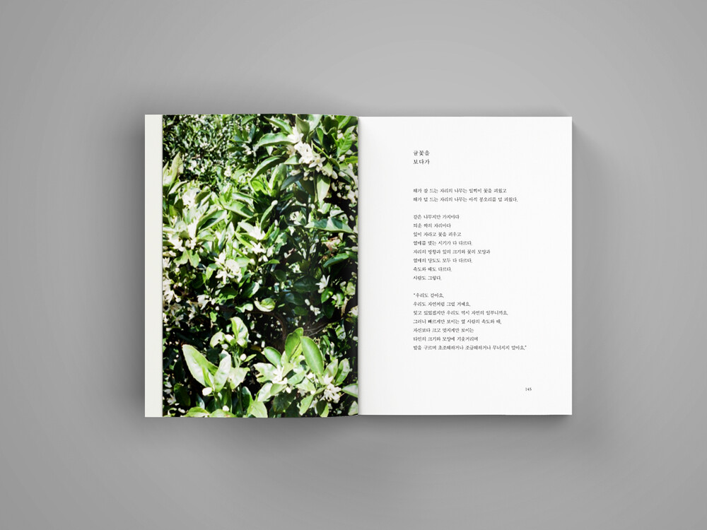 제주 봄 풍경에서 영감을 받은 책 얼굴로 봄의 푸르름, 한 해의 시작과 희망을 상징하는 신비로운 자연의 생동을 드러내기 위해 봄날의 볕, 겨울의 숨을 벗은 봄날의 따뜻한 숨을 상상하며 여린 새순의 베이지색을 바탕으로,