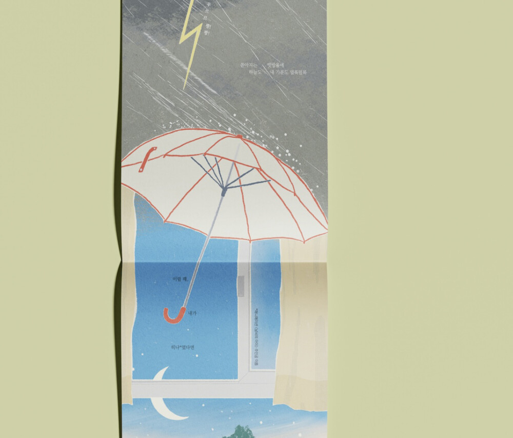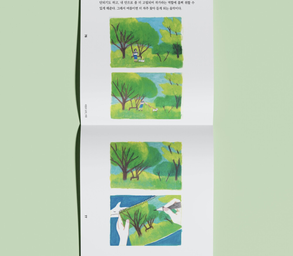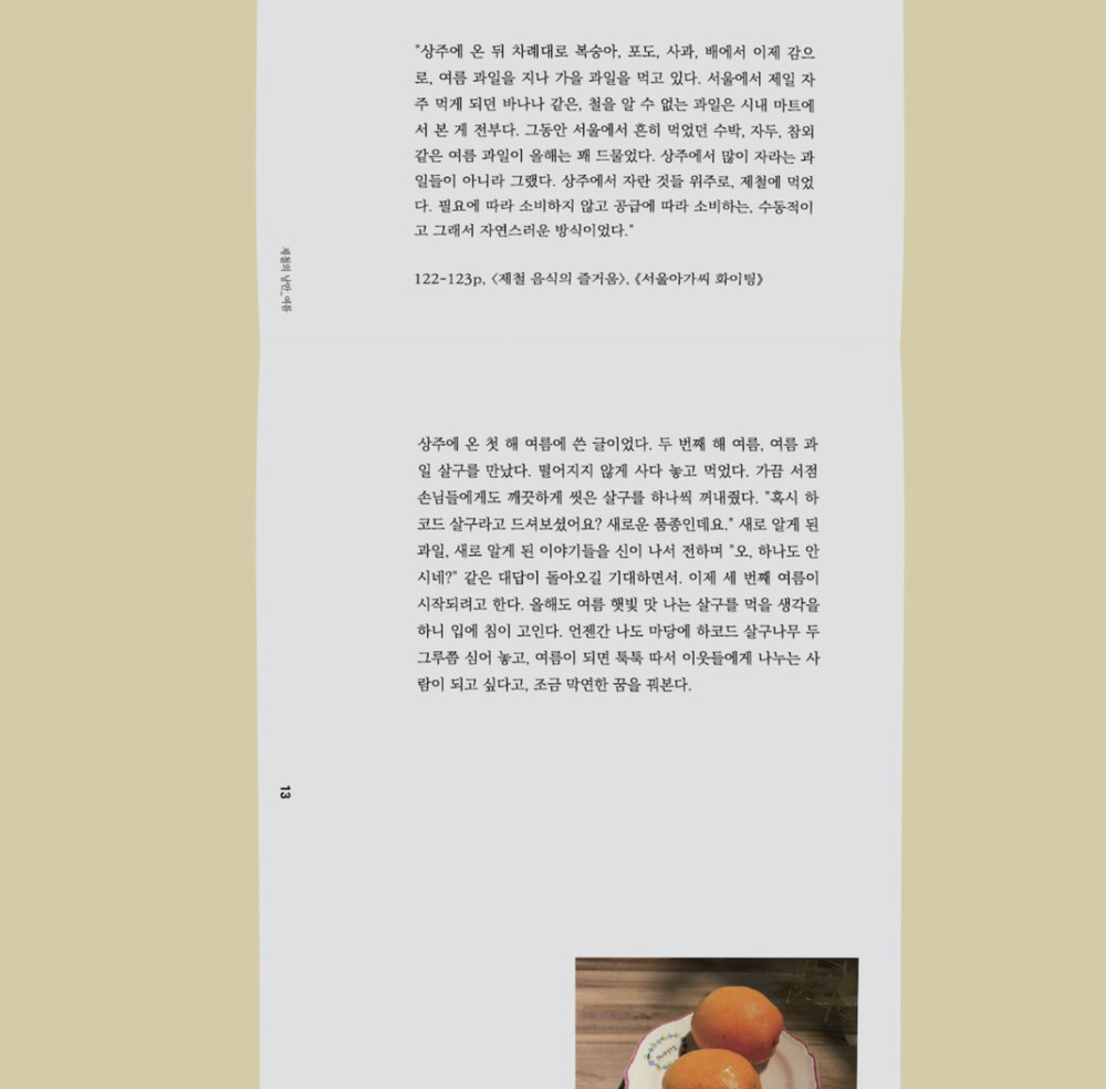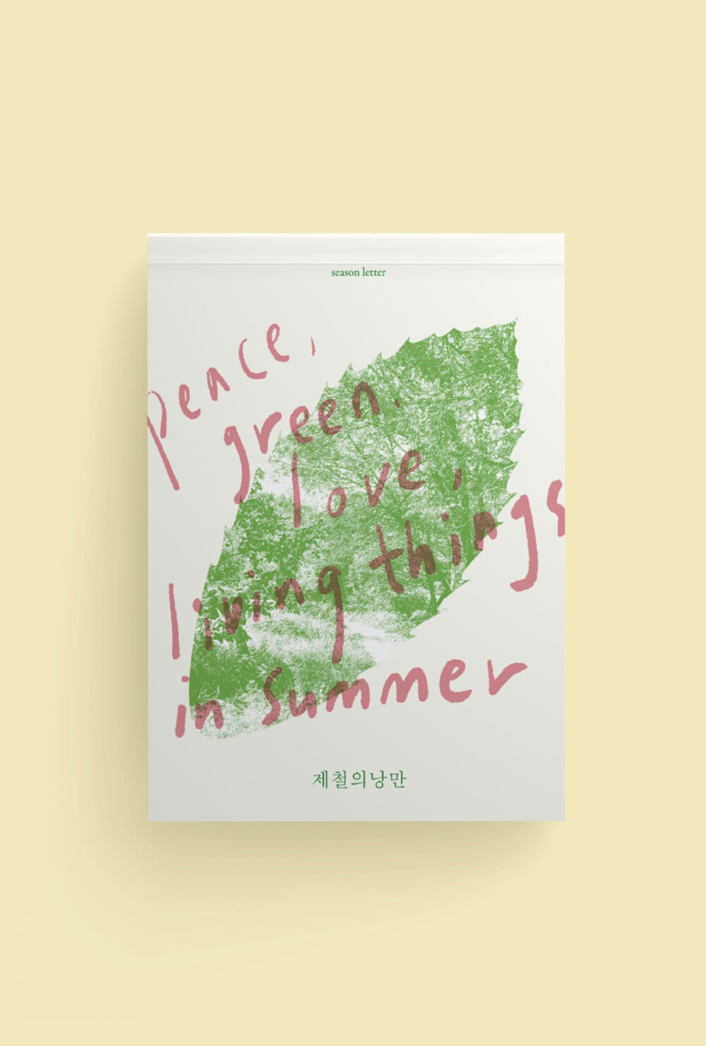 가장 제철에 그 계절을 기록하자는 목표를 가지고 사계절 연재를 시작했습니다. 첫번째 책은 첫번째 연재가 시작된 계절, 여름에 대한 기록입니다. 메일로 연재해서 스크롤을 올려서 볼 때 매력적인 방식으로 작업했고, 그 방식을 책에 녹여 담기 위해 상철 제본을 해보았습니다.