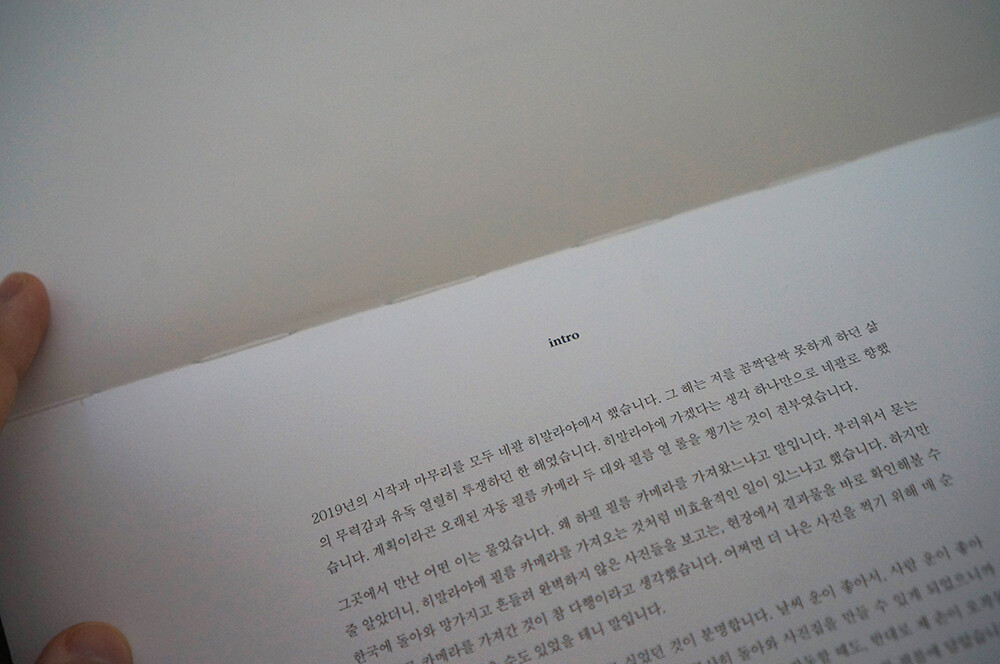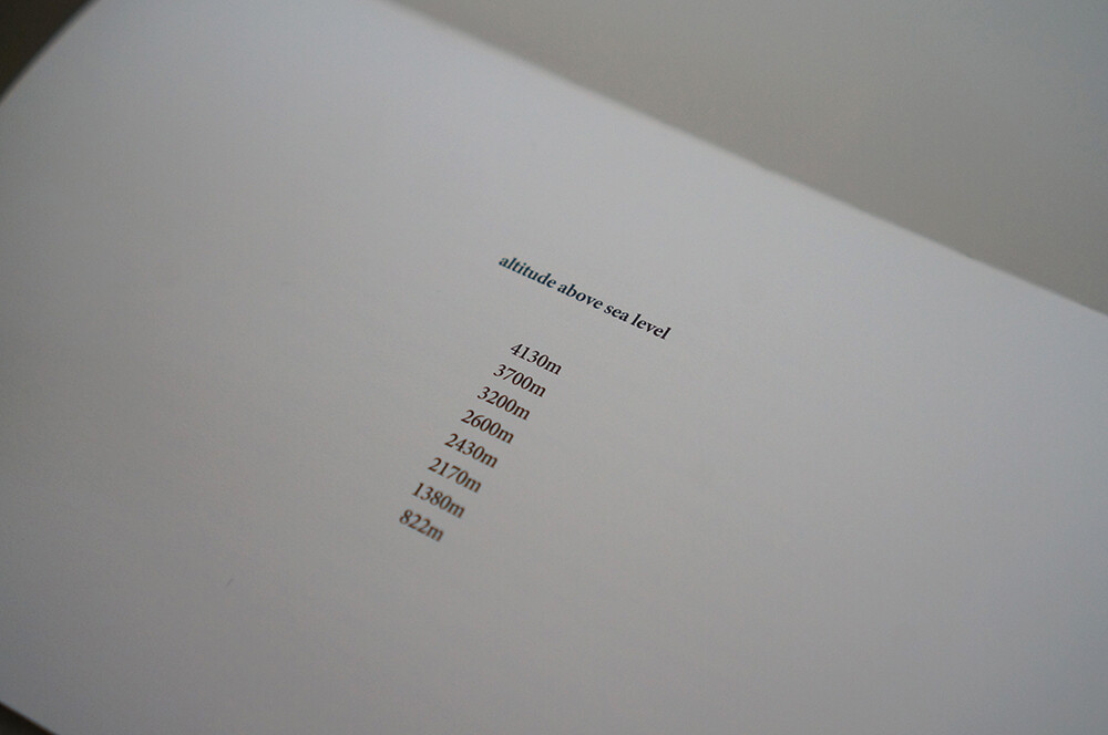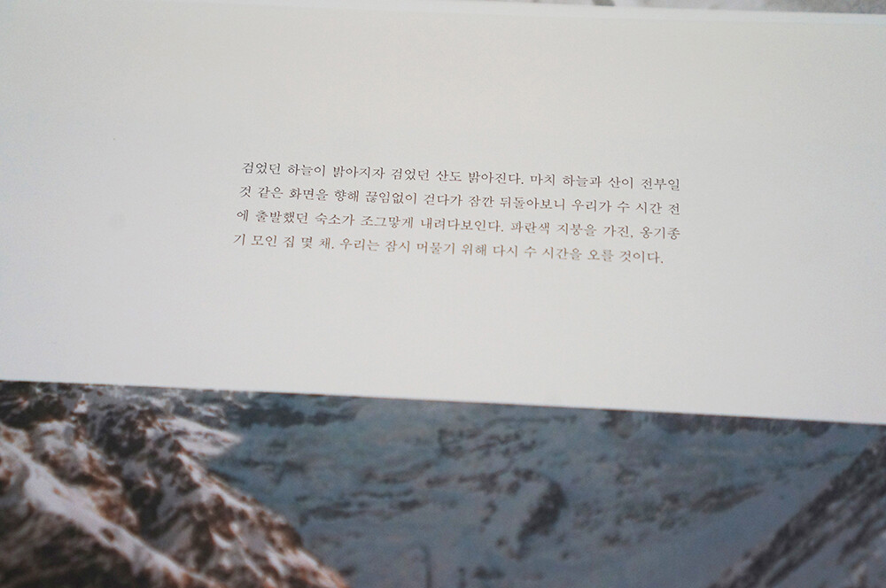 사진집은 해발고도를 따라 전개됩니다. 먼저, 사진집의 가장 아래에 위치한 페이지를 펼쳐주세요. 산행을 하듯 책장을 한 장씩 쌓으며 올라가 주세요. 익숙하지 않은 이 방식이 조금 어색하고 힘겨울 수도 있겠습니다. 그러나 산행이라는 것이 원래 그렇지 않던가요?