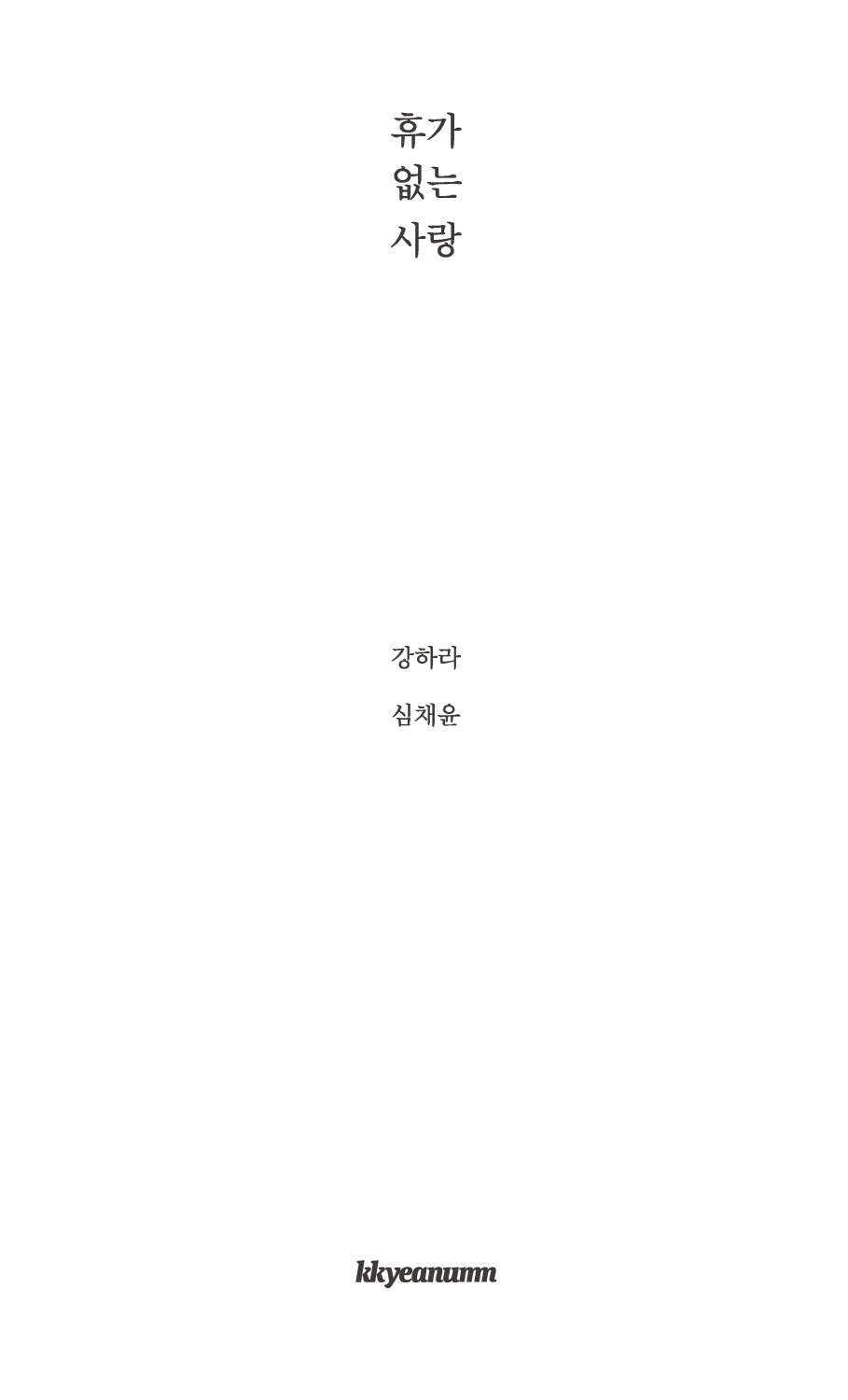 『휴가 없는 사랑』은 사랑의 현실을 인식하는 독립적 접근 방식에 관한 책이다. 사랑의 진부함과 식상함, 부정성을 인정하지 않는 기존의 이상화된 인식 방법에서 벗어나 자유롭지만 더 깊이 소속될 수 있는 다른 프레임을 제시한다. 사랑의 이중성과 유약함에 대한 사유와 성찰의 여정에는 두 사람의 현실적 경험이 녹아 있고 내적 성찰의 기록으로 이어진다. 실상에 대한 새로운 인식의 개념, 현실을 수용하며 반영하는 포용적 시각에는 독립성과 개체성을 기본값으로 하는 관조적 시선이 녹아 있다. 사랑의 시행착오 속에서 피어난 관계와 태도의 ‘왜’와 ‘어떻게’를 발견하는 여정이다.