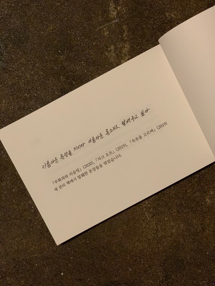 『무화과와 리슬링』 (2020, 독립출판), 『저크 오프』 (2019, 독립출판), 『속옷을 고르며』 (2019, warm gray and blue) 세 권의 책에서 발췌한 문장들을 엮었습니다.