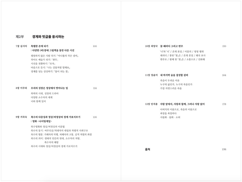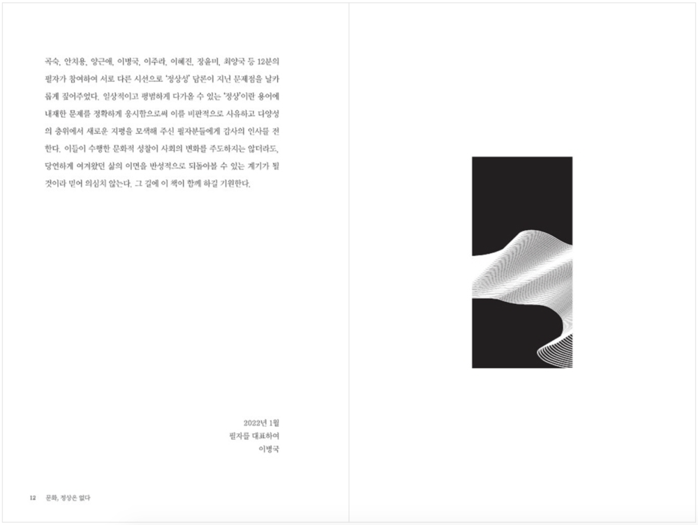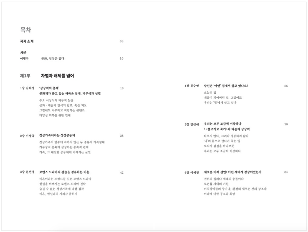 김시아, 김희경, 류수연, 문선영, 서곡숙, 안치용, 양근애, 이병국, 이주라, 이혜진, 장윤미, 최양국 등 12분의 필자가 참여하여 서로 다른 시선으로 ‘정상성’ 담론이 지닌 문제점을 날카롭게 짚어주었다. 일상적이고 평범하게 다가올 수 있는 ‘정상’이란 용어에 내재한 문제를 정확하게 응시함으로써 이를 비판적으로 사유하고 다양성의 층위에서 새로운 지평을 모색해 주신 필자분들에게 감사의 인사를 전한다. 이들이 수행한 문화적 성찰이 사회의 변화를 주도하지는 않더라도, 당연하게 여겨왔던 삶의 이면을 반성적으로 되돌아볼 수 있는 계기가 될 것이라 믿어 의심치 않는다. 그 길에 이 책이 함께 하길 기원한다.