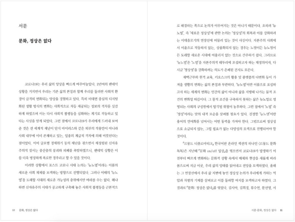 『르몽드 디플로마티크』 한국어판 온라인 섹션의 하나인 〈르몽드 문화 톡톡〉은 빠르게 변화하는 문화적 상황 속에서 매체와 현상을 새롭게 바라봄으로써 지금 이곳, 우리 삶의 양태를 읽어내고 전망을 모색하였다. 올해는 그 연장선에서 우리 삶 저변에 놓인 정상성 논의가 우리에게 가하는 억압과 차별의 기제를 살펴보고 이를 돌파할 여지를 모색하고자 하였다. 그 결과로 『문화: 정상은 없다』를 엮었다.