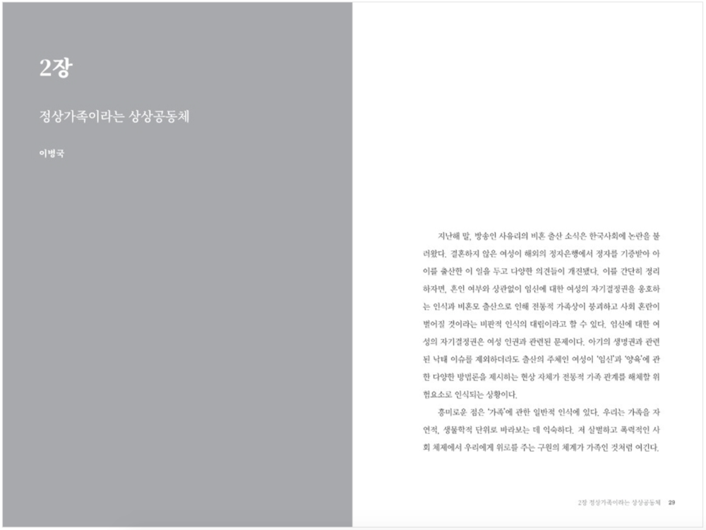 “우리 사회에서 오랫동안 ‘결혼, 출산, 육아’의 과정은 인생의 필수코스처럼 여겨졌던 것이 사실이다. 이를 기반으로 한, 가족 형태의 정착은 ‘평범함’. ‘일반적’이라는 의미와 결합하여 정상적 가족에 대한 집착으로 이어져 왔다. 결혼을 통한 정상가족이라는 틀은 TV드라마를 통해 고정적 이미지로 구축되곤 했다. 수많은 로맨스 또는 가족드라마에서 결혼은 사랑을 이루기 위한 행복한 결말로 작동되었던 것이다. TV드라마에서 결혼은 남녀의 결합 또는 사랑의 완성이라는 의미를 재현하는 경우가 더 많았다. 물론 모든 TV드라마에 해당되는 것은 아니지만, 1960년대 이후 이어져 온 가족드라마의 흐름을 살펴봤을 때, 한국 방송에서 결혼을 전제한 가족 형태에 대한 집착은 여전히 이어져 오고 있음을 알 수 있다. ”