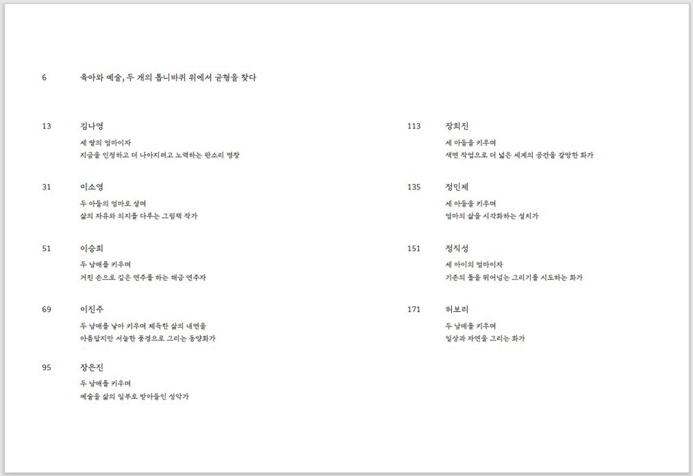 아이들을 낳아 키우는 다른 예술가들은 어떻게 이 시간을 보냈을까? 엄마의 역할을 하면서 어떻게 예술 활동을 지속하는 것일까? 시간에 휩쓸리지 않고 자신의 일을 하는 엄마 예술가들의 이야기가 궁금해졌다. 아이들을 낳아 키우며 예술 활동을 하는 엄마 예술가들의 소소하고 개인적이며 일상의 살아가는 이야기를 듣고 싶었다. 무엇보다 예술 활동을 지속해야만 하는 양육자의 상황을 공유하고, 예술 활동을 더 깊이 이해하기 위한 또 하나의 접근법으로 인터뷰를 시작하였다.