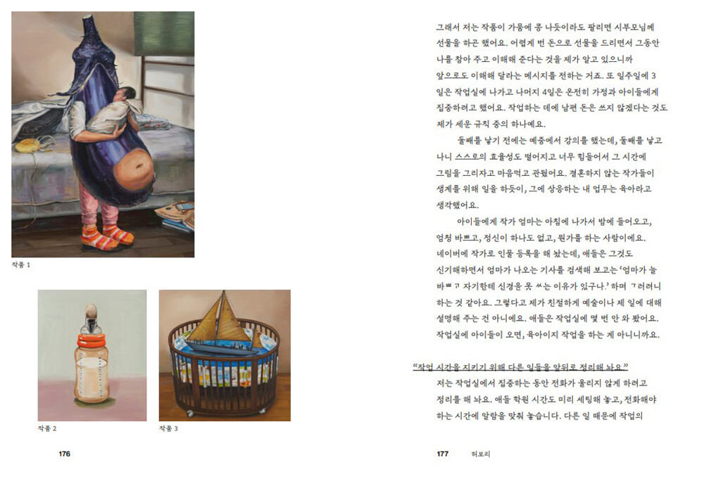 "그림 앞에서 자꾸 어슬렁거리는 게 다시 궤도를 찾는 데 도움이 되더라고요. 시간은 흘러가고 아이는 자라니까, 또 아이가 자라면 시간을 확보하기가 훨씬 수월하니까, 스스로를 용서하면서 그 시기를 버티는 거죠. 어쩔 수 없이 작업을 멈추게 되었다 면, 작품을 발표할 때의 창피함을 용서해 주라고 말하고 싶어요." (정직성)