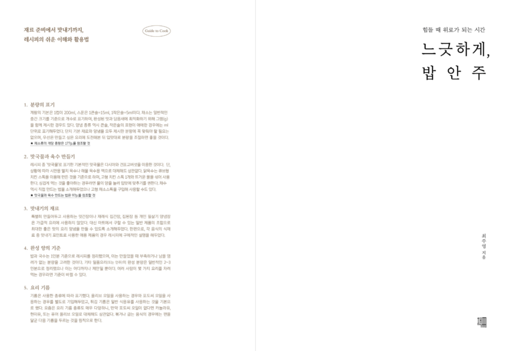 아이러니하게도 메뉴 개발자라는 저자의 일적 방향성은 1~2인 가정의 라이프스타일에 맞춰 만족스럽고 간편한 집밥 키트를 제공하는 것이지만, 그간 지속된 팬데믹 시기를 거치면서 그의 개인적 가치관도 조금씩 변했다. 단지 쉽게 얻는 맛과 공들여 얻는 맛은 모두 필요한 부분이니, 집에서 손수 만들어 먹는 한 끼의 진정성을 아는 사람을 위해 푸근한 인간미까지 담은 별미 레시피를 알려준다.