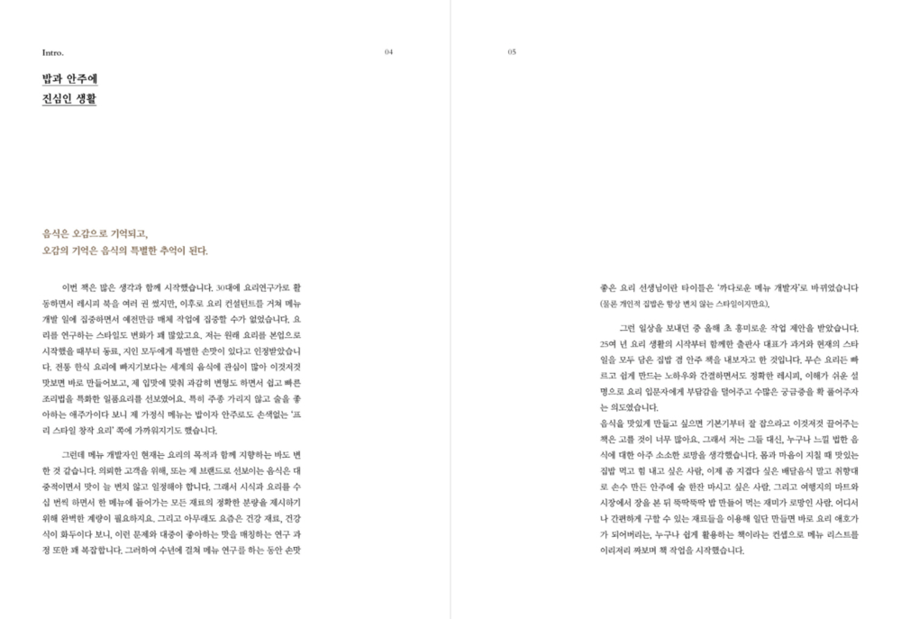 이번 책은 긴 요리 인생에서 발견한 맛, 이를 통해 얻은 레시피를 에피소드와 함께 총정리한 에세이 스타일로 기획했다. 한편으로 혼밥과 홈밥, 홈술까지 일상이 된 현시대의 독자들이 만들어 먹기 편한 음식과 레시피를 담은 ‘활용도 높은’ 요리책으로 완성했다. 마트의 흔한 식재료는 물론 온라인 몰에서 발견한 다소 생소한 식재료까지 총망라해 쉽게, 빨리 만들고 지친 하루에 혼자, 즐거운 날 여럿이 ‘느긋하게’ 맛을 즐기는 밥이자 안주(밥안주)를 소개한다.