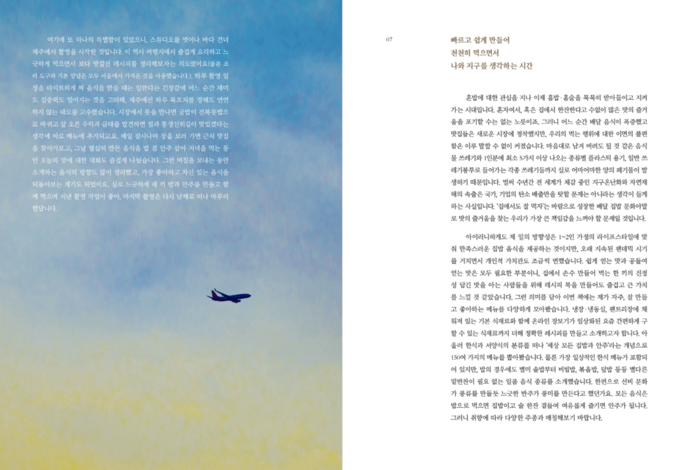 이번 책은 작업에 있어서도 또 하나의 특별함을 담았다. 스튜디오를 벗어나 바다 건너 제주에서 촬영을 시작했으며, 이 역시 여행지에서 즐겁게 요리하고 느긋하게 먹으면서 보다 맛깔진 레시피를 정리해보자는 의도였다. 시장에서 톳을 만나면 굴밥이 전복톳밥으로 바뀌고 살 오른 우럭과 금태를 발견하면 찜과 통생선튀김이 맛있겠다는 생각에 바로 메뉴에 추가하는 한편, 그날 열심히 만든 음식을 밥 겸 안주 삼아 저녁을 먹으면서 ‘오늘 밥안주의 맛’에 대한 대화도 즐겁게 나눴다. 그런 며칠을 보내는 동안 소개하는 음식의 방향도 많이 정리했고, 가장 좋아하고 자신 있는 음식을 되돌아보는 계기가 될 수 있었다. 느긋하게 세 끼 밥과 안주를 만들고 함께 먹으며 지낸 첫 촬영 느낌이 좋아 마지막 촬영은 다시 남해로 떠나 마무리했다.