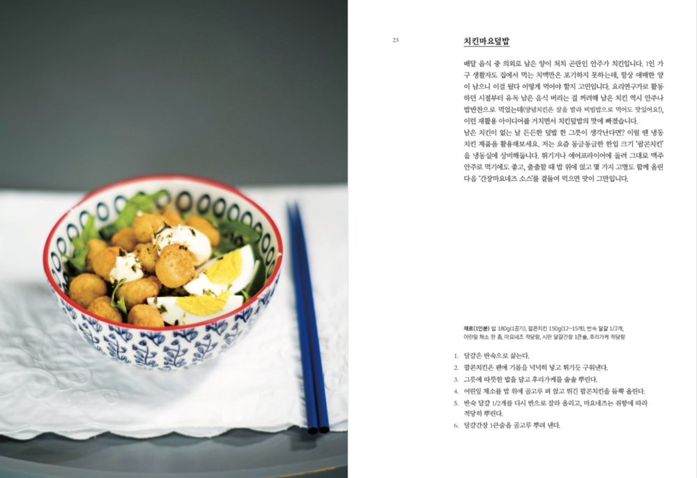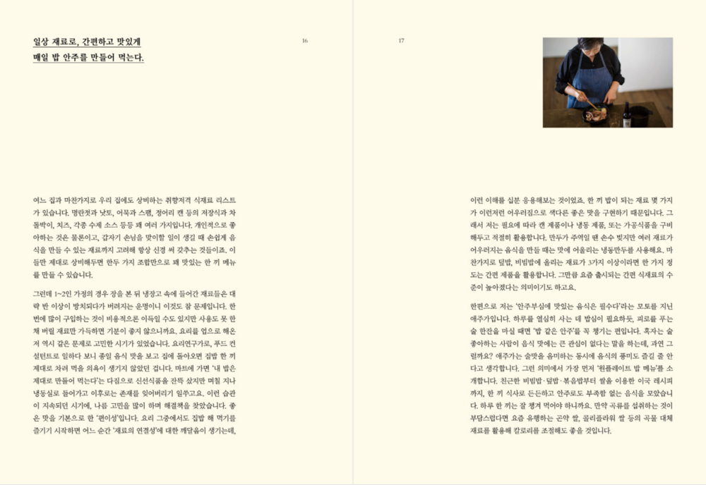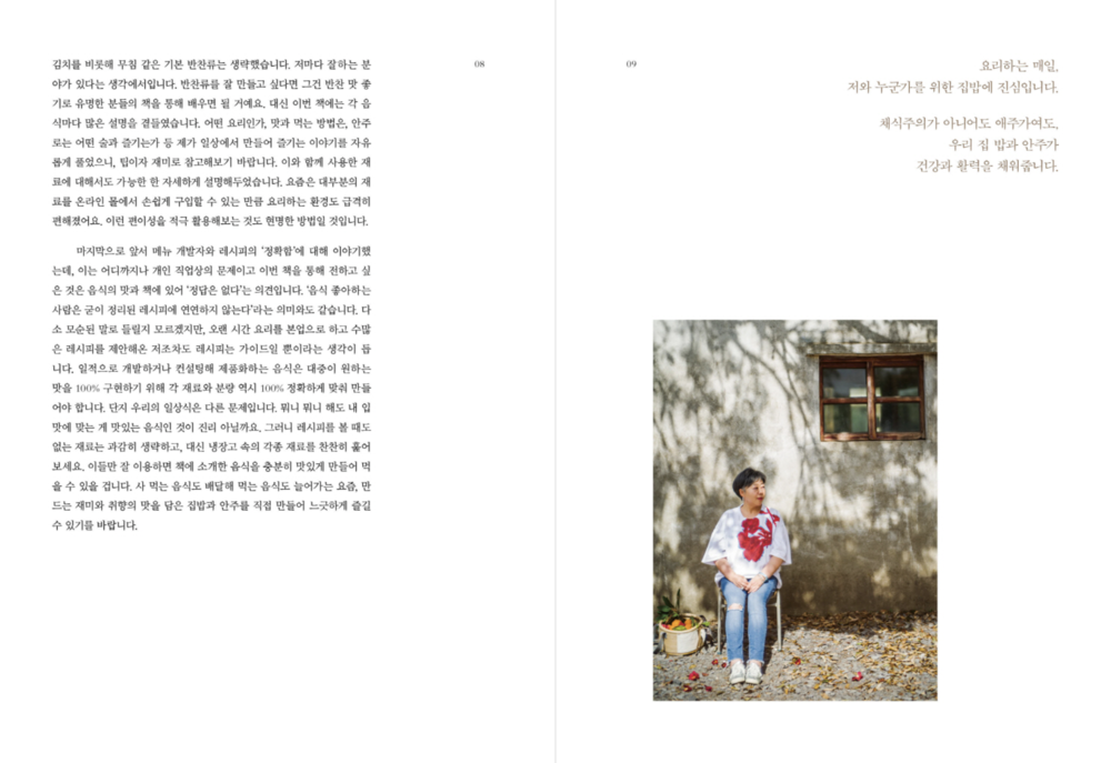 한편으로 이번 책은 혼밥과 홈밥, 홈술까지 일상이 된 시기의 2040 독자들이 만들어 먹기 편한 밥이자 안주 음식을 총망라한 ‘활용도 높은’ 요리책으로 완성했다. 따라서 마트의 흔한 식재료는 물론 온라인 몰에서 발견한 다양한 식재료들까지 더해 쉽게, 빨리 만들고 지친 하루에 혼자, 즐거운 날 여럿이 여유롭게 맛을 즐기는 ‘밥 안주’를 두루 맛볼 수 있다. 저자가 긴 요리 인생에서 발견한 맛, 이를 통해 얻은 레시피를 에피소드와 함께 집필한 스타일로 경험담, 요리 팁을 에세이처럼 읽는 재미도 클 것이다.