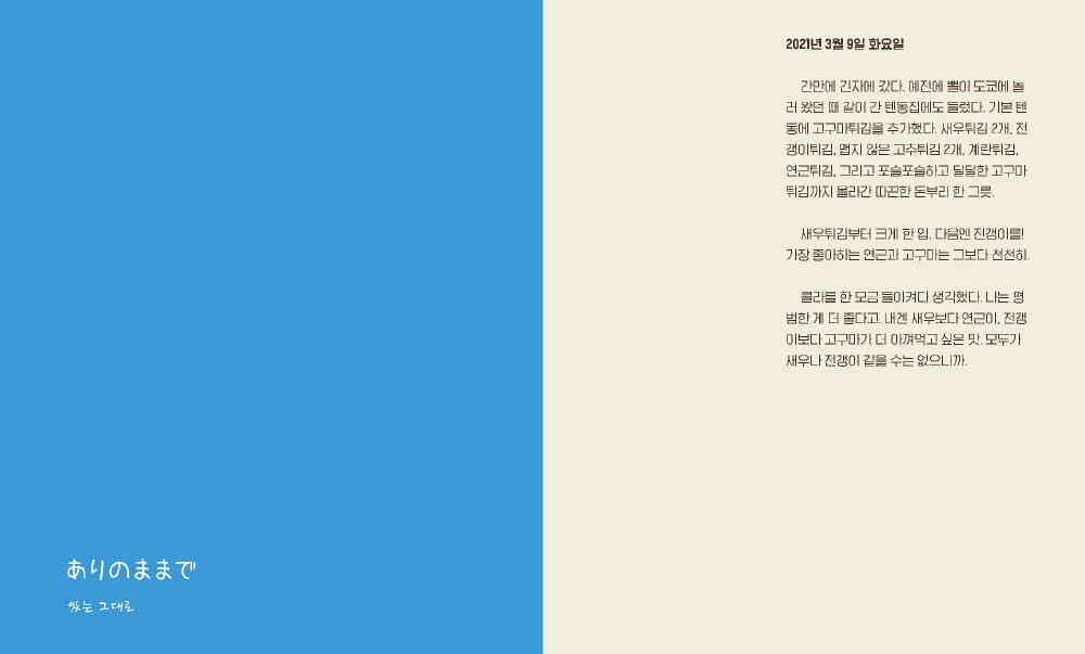 <나는 그렇게 생각해>에서는 1인 생활자로서, 외국인으로서, 학생으로서, 작가로서, 알바생으로서, 여성으로서 — 야림이 일본에서 단단한 자기 자리를 만들어가는 여정을 따라가 봅니다. 그의 시간은 서울에서 오래 정을 나누던 사람들로부터 생겨난 물리적 거리, 낯선 곳에서 새로 사귄 사람들과 나눈 낯선 말씨, 처음 가 본 생경한 공간 속에 깃들어 있습니다. 알 수 없는 미래보다는 지금, 이 순간에 충실할 것을 가르쳐준 일본에서 자신만의 길을 찾아가고자 하는 야림과, 그를 지지하고 응원하는 사람들이 만들어낸 '오늘들' 속으로 함께 걸어 들어가 봅니다.