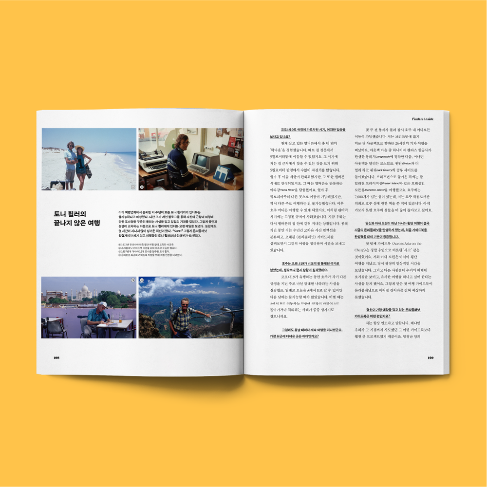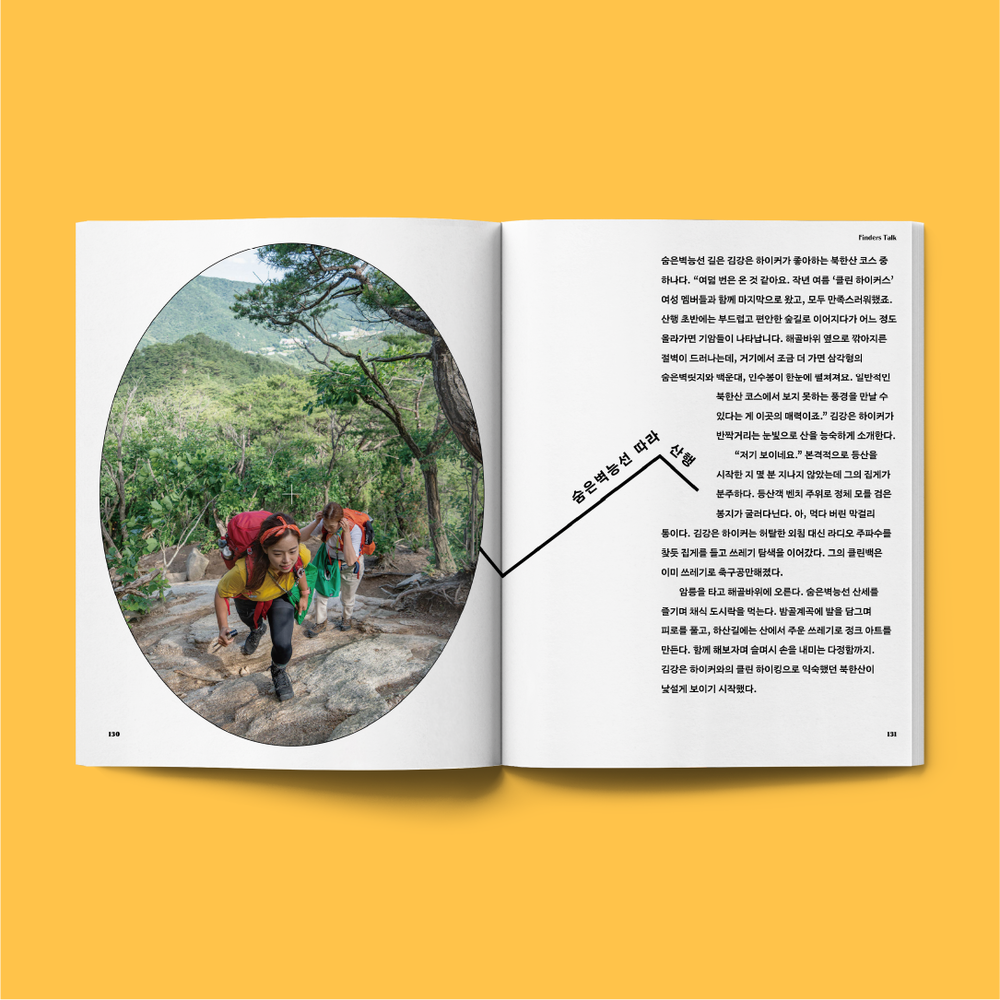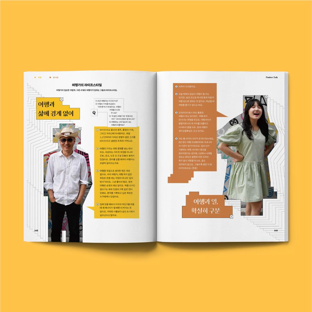 파인더스 매거진은 뉴노멀 시대의 지역과 삶의 양식, 여가에 관한 현재와 근미래의 트렌드, 새로운 라이프스타일을 아우르는 발견자의 이야기에 주목합니다. 파인더스 매거진 창간호의 발견자는 바로 수상한 여행가! 고정관념과 편견에서 벗어나 다소 엉뚱하고 낯선 시도를 거듭한 여행가들은 우리를 더 먼 곳으로 인도하고, 익숙한 곳도 새롭게 발견할 수 있는 계기를 만들어주었죠. 10인의 수상한 여행가들이 남긴 흥미진진한 이야기를 통해 우리가 진정 여행을 떠나는 이유와 여행을 지속하는 방법에 다가서보세요.