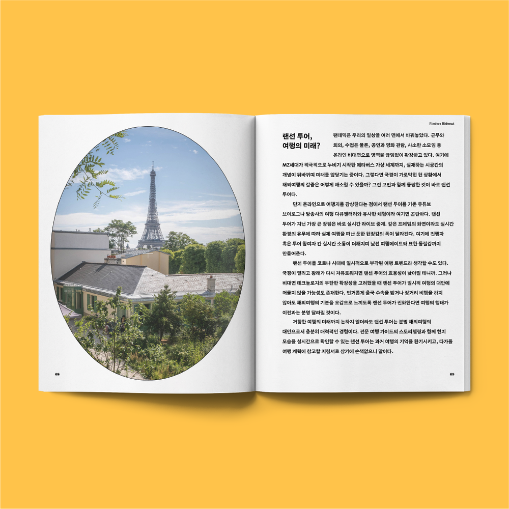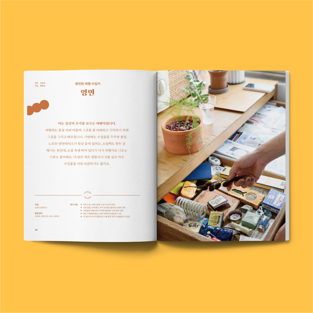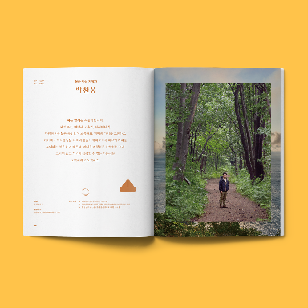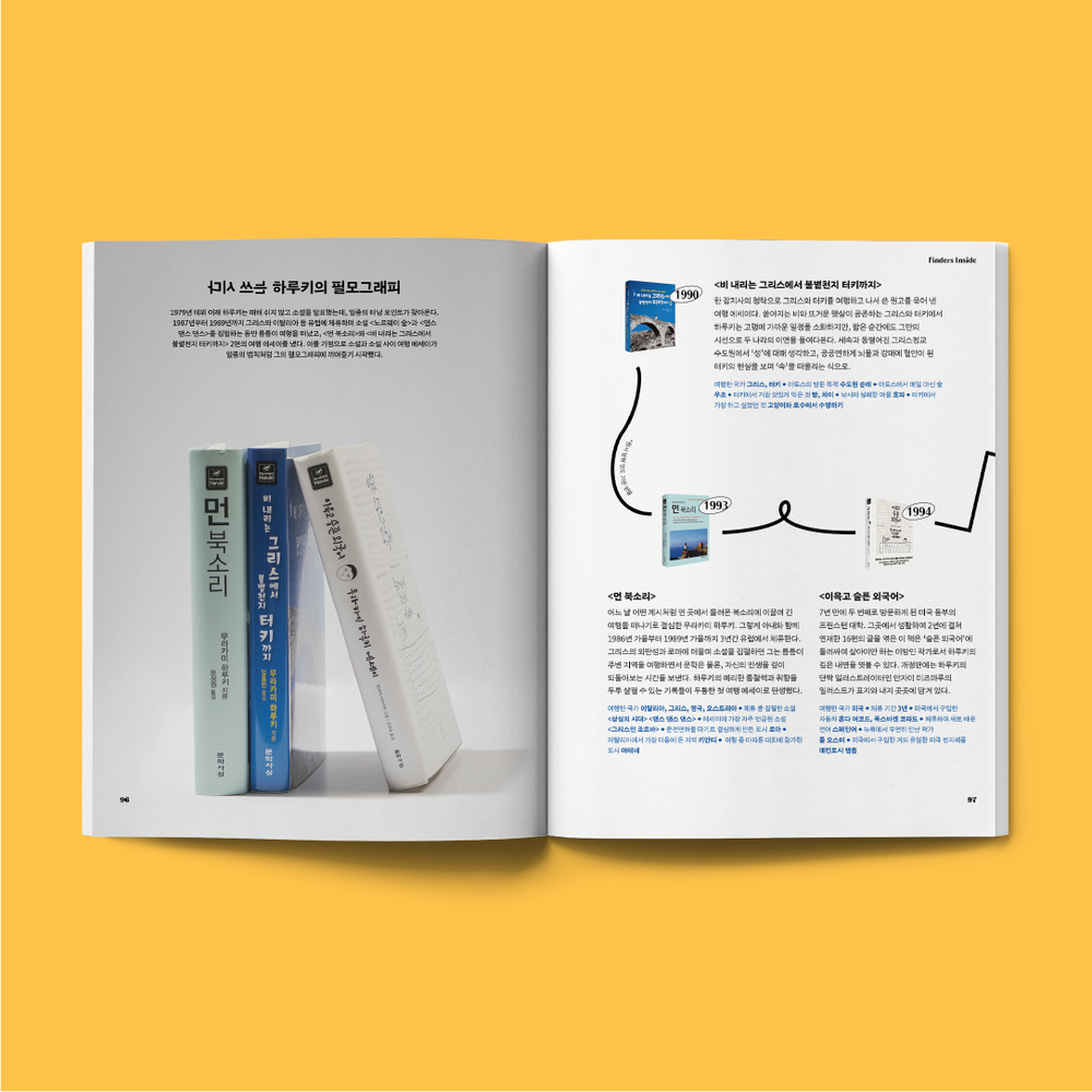파인더스 매거진은 뉴노멀 시대의 지역과 삶의 양식, 여가에 관한 현재와 근미래의 트렌드, 새로운 라이프스타일을 아우르는 발견자의 이야기에 주목합니다. 파인더스 매거진 창간호의 발견자는 바로 수상한 여행가! 고정관념과 편견에서 벗어나 다소 엉뚱하고 낯선 시도를 거듭한 여행가들은 우리를 더 먼 곳으로 인도하고, 익숙한 곳도 새롭게 발견할 수 있는 계기를 만들어주었죠. 10인의 수상한 여행가들이 남긴 흥미진진한 이야기를 통해 우리가 진정 여행을 떠나는 이유와 여행을 지속하는 방법에 다가서보세요.