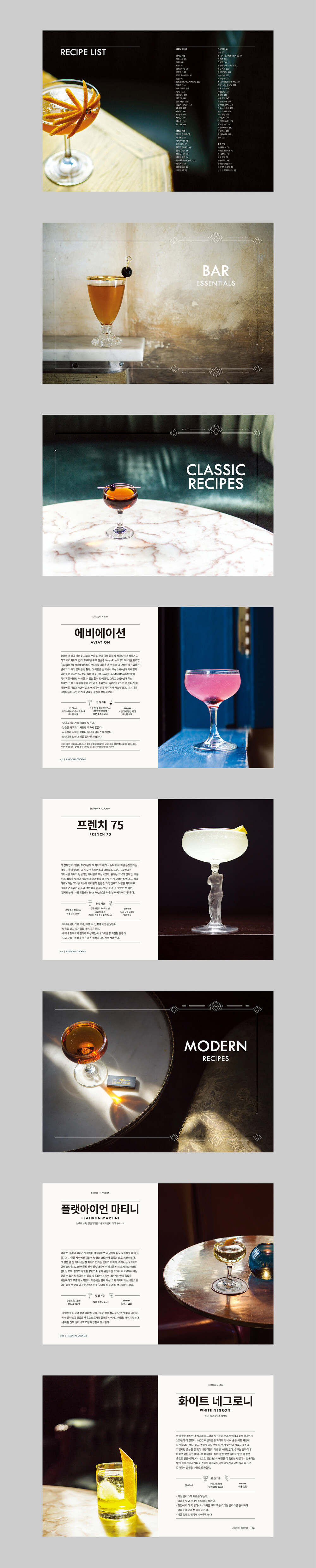 이 책에는 150가지 칵테일 레시피를 수록했다. 김렛(Gimlet)부터 올드 패션(Old-Fashioned)에 이르기까지 클래식 칵테일을 전부 펼쳐냈으며, 이들을 제대로 변형한 모던 칵테일을 당대 최고의 바텐더들이 알려준 최고의 비법으로 소개한다. 클래식 표본이 존재하나 모던칵테일로 변형하는 매우 엄격한 공식이 따로 있는 것은 아니다. 실제로 칵테일은 여러 차례 시행착오를 거치며 만들어진다. 가장 기본이 되는 클래식 레시피는 모듈러 건축 기법으로 이루어졌다. 스피릿을 베이스로 하여 시트러스, 설탕 약간, 비터스 1dash(3~6방울-옮긴이)를 차곡차곡 쌓는다. 위스키를 베이스로 하는 칵테일의 경우 베이스를 애플잭(applejack)으로 바꾸고 나머지 비율을 제대로 유지하면 완전히 색다른 칵테일을 즐길 수 있는 것이다.