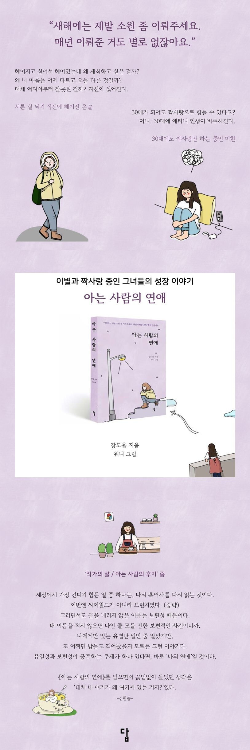 이 소설의 가치는 공감이다. 이별과 짝사랑을 통해 겪는 희로애락과 그 속에서 뚜렷하게 보이는 마음의 병은 독자가 한 번쯤은 겪어 봤을 법한 이야기다. 사랑에는 특별함만 있는 게 아니다. 누구보다 멋진 사랑을 하는 것 같지만, 누구나 사랑 앞에서는 밑바닥이 드러나게 된다. 어릴 때 받은 상처는 가슴 한 구석 밑바닥에 자리 잡게 되고, 성인이 되어서는 자신도 모르게 사랑하는 이의 앞에서 상처를 드러내게 된다. 소설 〈아는 사람의 연애〉는 유년 시절 상처를 용기로 치유해 가는 과정을 그려냈다. 여러 번 해본 사랑임에도 서툴고 실수하지만, 그 속에서 성장이 있고 일상의 소중한 가치를 깨달으며 희망을 품고 살아가는 우리들의 평범한 이들의 사랑 이야기를 재미있고 감동적으로 풀어냈다.
