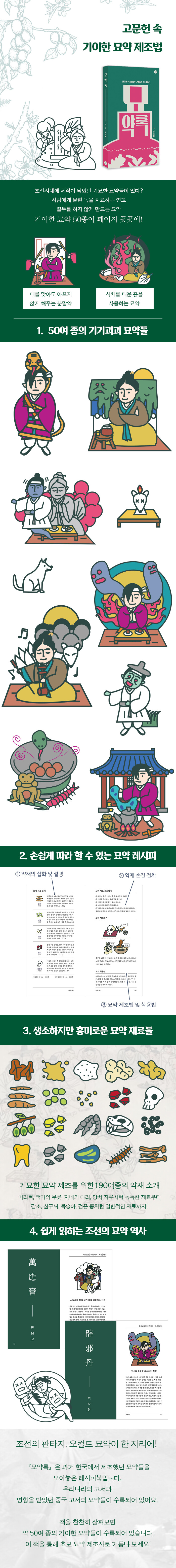 <묘약록>은 과거 한국에서 제조했던 묘약들을 모아놓은 레시피북입니다. 그렇기에 우리나라의 고서와 영향을 받았던 중국 고서들의 묘약이 수록되어 있죠. 책을 찬찬히 살펴보면 50여 종의 기이한 묘약들이 수록되어 있습니다. 듣기만 해도 설레는 묘약 제조법이 있는데요. 질투를 사라지게 하는 환약, 귀신을 볼 수 있게 하는 환약, 매를 맞아도 통증을 느끼지 못하게 만드는 약, 유체 이탈을 치료하는 약, 사람에게 물려 생긴 독을 치료하는 약, 소지만 해도 화살이 피해 가는 약, 귀신과 요물을 퇴치하는 약, 자신도 모르게 진실을 말하게 하는 약 등입니다.