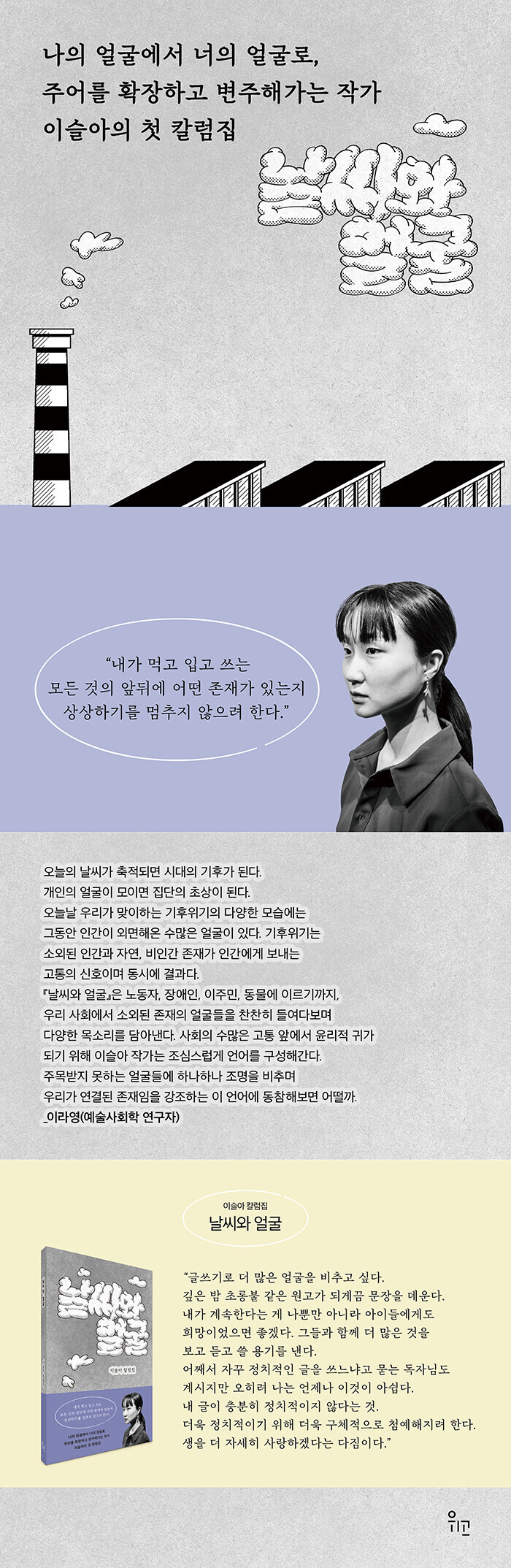 『날씨와 얼굴』은 이슬아 작가가 지난 2년간 경향신문에 기고한 칼럼을 다시 쓰고, 새로 쓴 글을 더해 엮은 책이다. “얼굴을 가진 우리는 가속화될 기후위기 앞에서 모두 운명공동체다”라는 문장으로 시작하는 이 책은 기후위기의 다양한 모습 뒤편에 그동안 인간이 외면해온 수많은 얼굴이 있음을 상기시키며 이 시대가 외면해온 반갑고 애처로운 얼굴들을 불러낸다. 때로 그것은 ‘나’의 얼굴이기도 하지만 무엇보다 공장식 축산으로 사육된 동물과 택배 노동자와 장애인과 이주여성의 얼굴 들이다. “내가 먹고 입고 쓰는 모든 것의 앞뒤에 어떤 존재가 있는지 상상하기를 멈추지 않으려 한다”는 저자는 분명 어떤 얼굴들은 충분히 말해지지 않으며 그들에 대해 말하려면 특정 방향으로 힘이 기우는 세계를 탐구해야 한다고 말한다. 이것은 이슬아 작가의 다짐이기도 하다. 중요한 이야기를 중요하게 다루고, 누락된 목소리를 정확하게 옮겨 적는 것. 그것이 글을 쓰는 사람으로서 배운 저항의 방식임을 곱씹는다. 저자는 그 어느 때보다 여러 사람에게 묻고 여러 책을 참조하고 부지런히 자료를 조사하며 이 책을 완성했다.