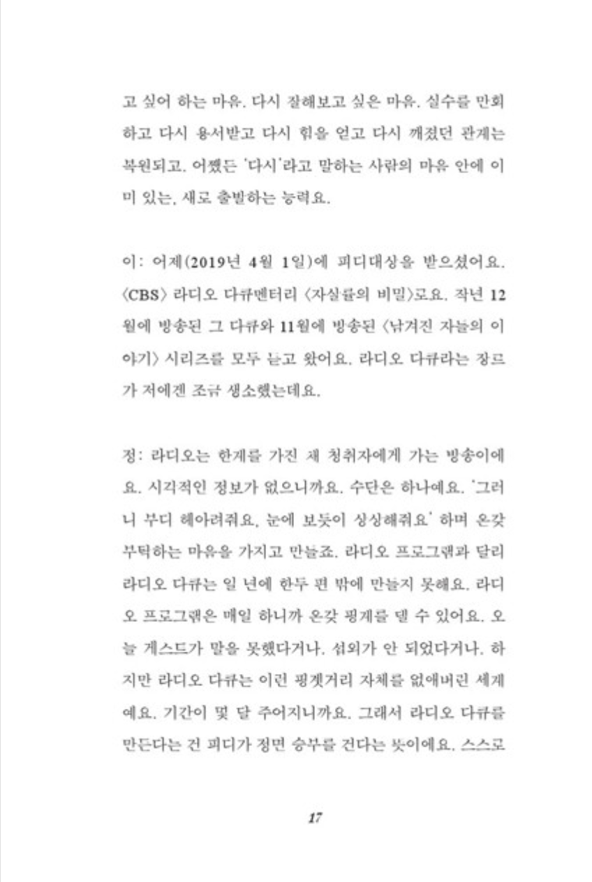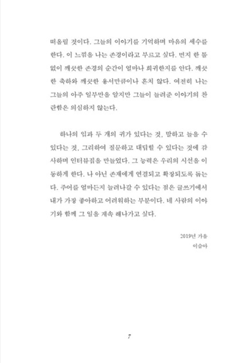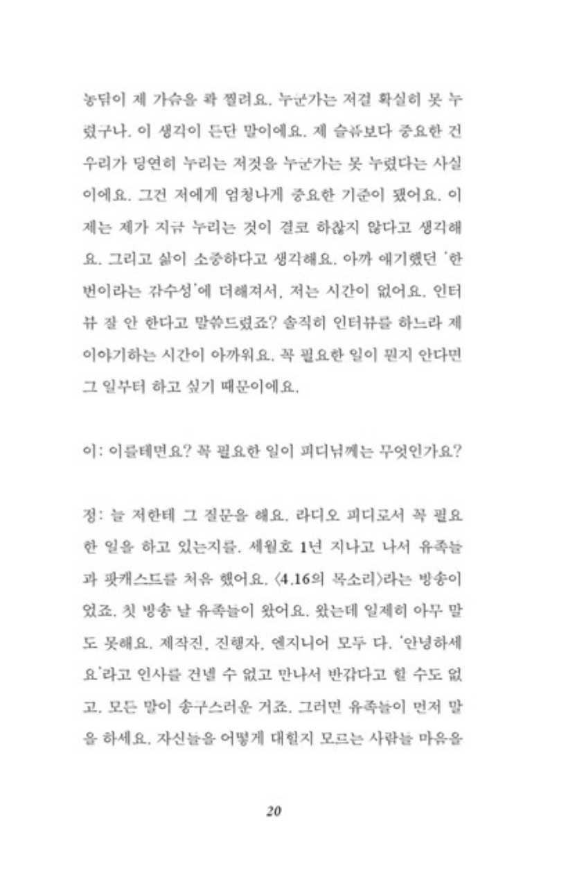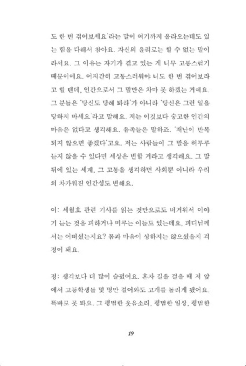 그 분들은 ‘당신도 당해 봐라‘가 아니라 ‘당신은 그런 일을 당하지 마세요‘라고 말해요. 저는 이것보다 숭고한 인간의 마음은 없다고 생각해요. 유족들은 말하죠. 재난이 반복되지 않으면 좋겠다‘고요. 저는 사람들이 그 말을 허투루 듣지 않을 수 있다면 세상은 변할 거라고 생각해요. 그 말 뒤에 있는 세계, 그 고통을 생각하면 사회뿐 아니라 우리의 차가워진 인간성도 변해요.