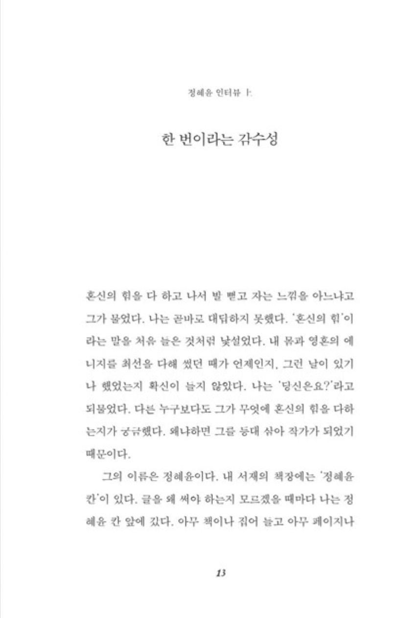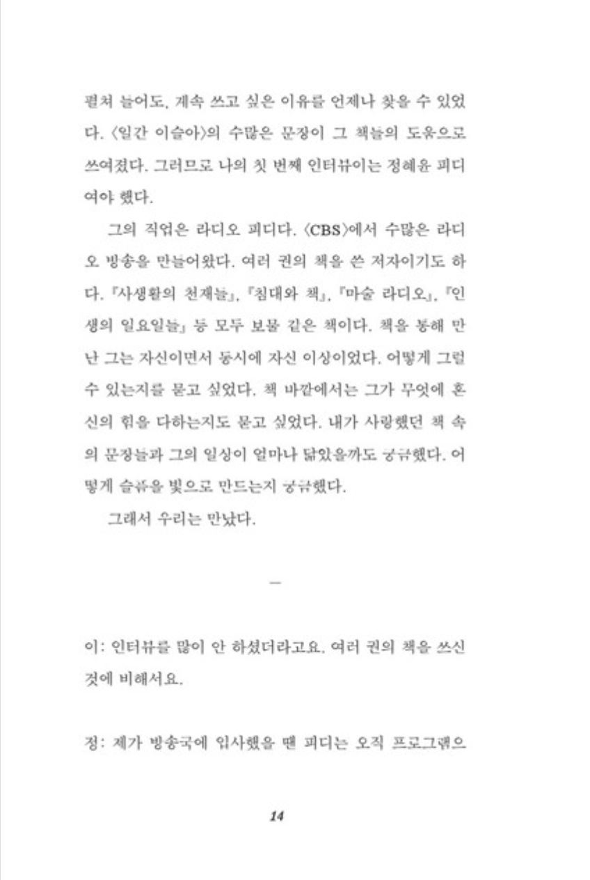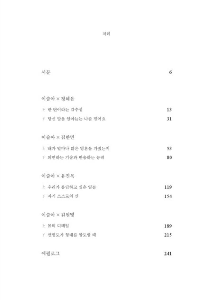이슬아의 첫 번째 인터뷰집. 정혜윤, 김한민, 유진목, 김원영과의 긴 대화가 담겨 있다. 네 사람의 이야기를 보고 들은 뒤 감탄과 절망을 오가며 새로운 자신을 향해 나아간다. 2019년 <일간 이슬아> 시즌 2에 연재된 인터뷰 원고를 모아 다듬은 책이다.