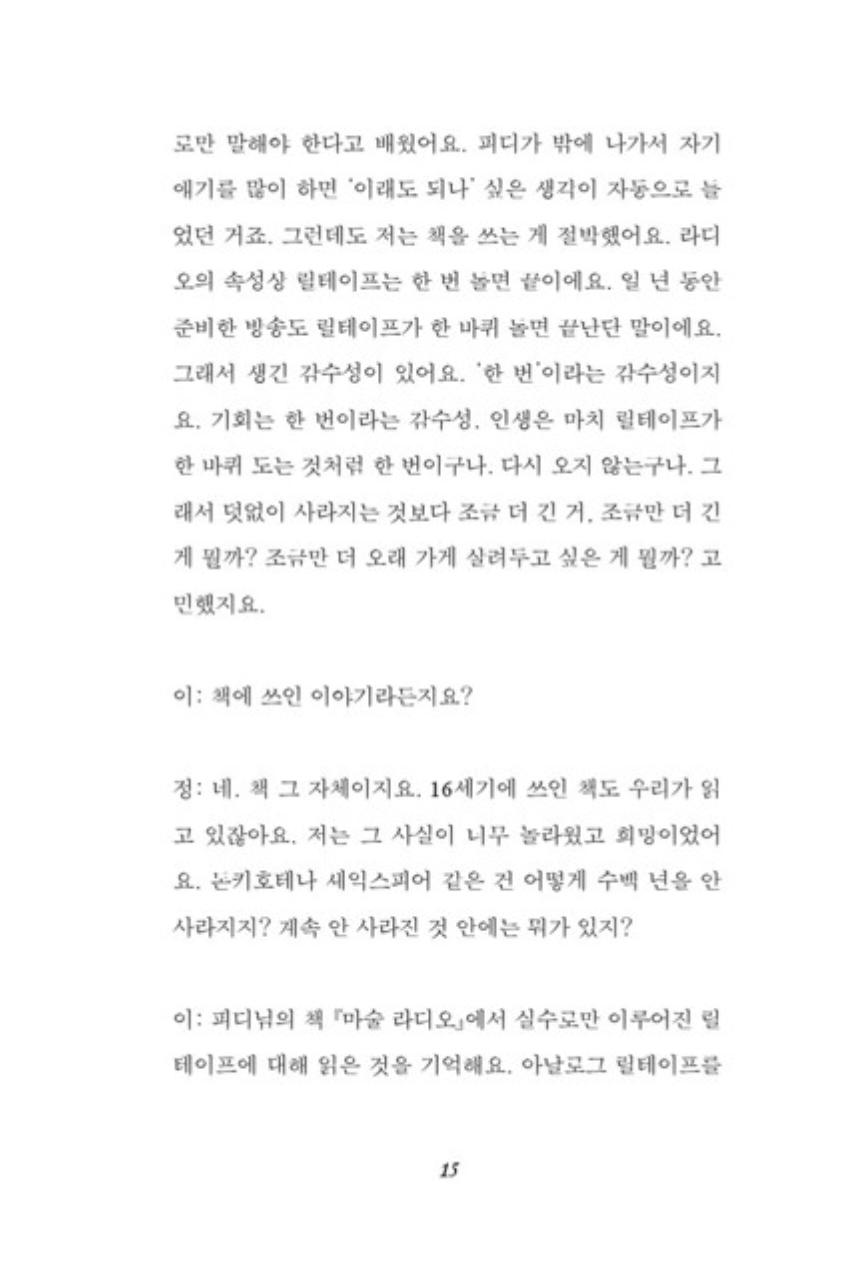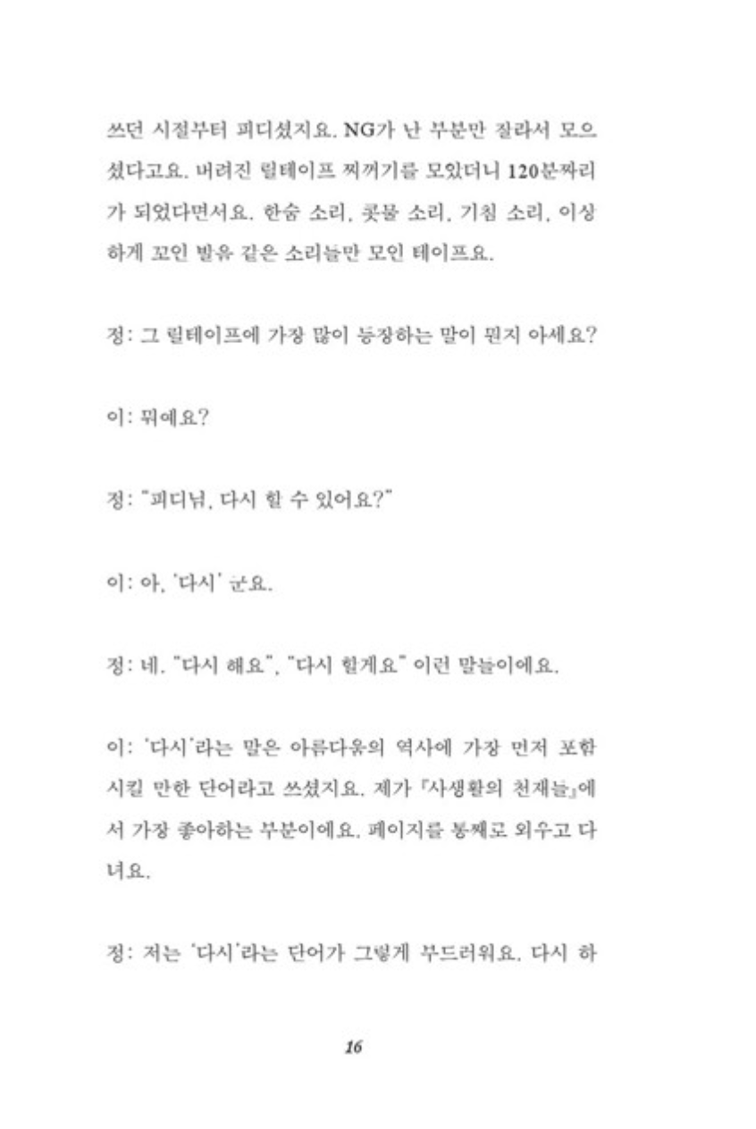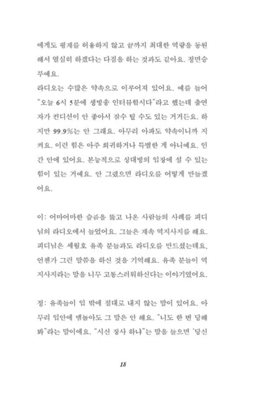 이슬아의 첫 번째 인터뷰집. 정혜윤, 김한민, 유진목, 김원영과의 긴 대화가 담겨 있다. 네 사람의 이야기를 보고 들은 뒤 감탄과 절망을 오가며 새로운 자신을 향해 나아간다. 2019년 <일간 이슬아> 시즌 2에 연재된 인터뷰 원고를 모아 다듬은 책이다.