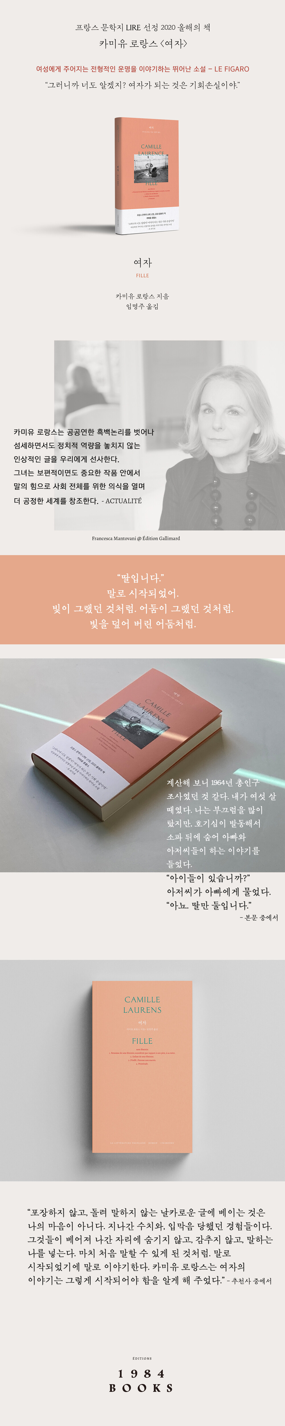 프랑스의 소설가이자 에세이스트로 프랑스 문학계에서 중요한 작가 중 한 명으로 손꼽히는 카미유 로랑스의 <여자>가 1984Books에서 출간되었다. 프랑스의 저명한 문학지 LIRE에서 2020년 '올해의 책'으로 선정한 바 있는 <여자>는 여성성이 남성성보다 낮게 평가되는 세상에서 소녀, 여자, 그리고 어머니로서의 개인적이고 통찰력 있는 경험을 이야기한다.