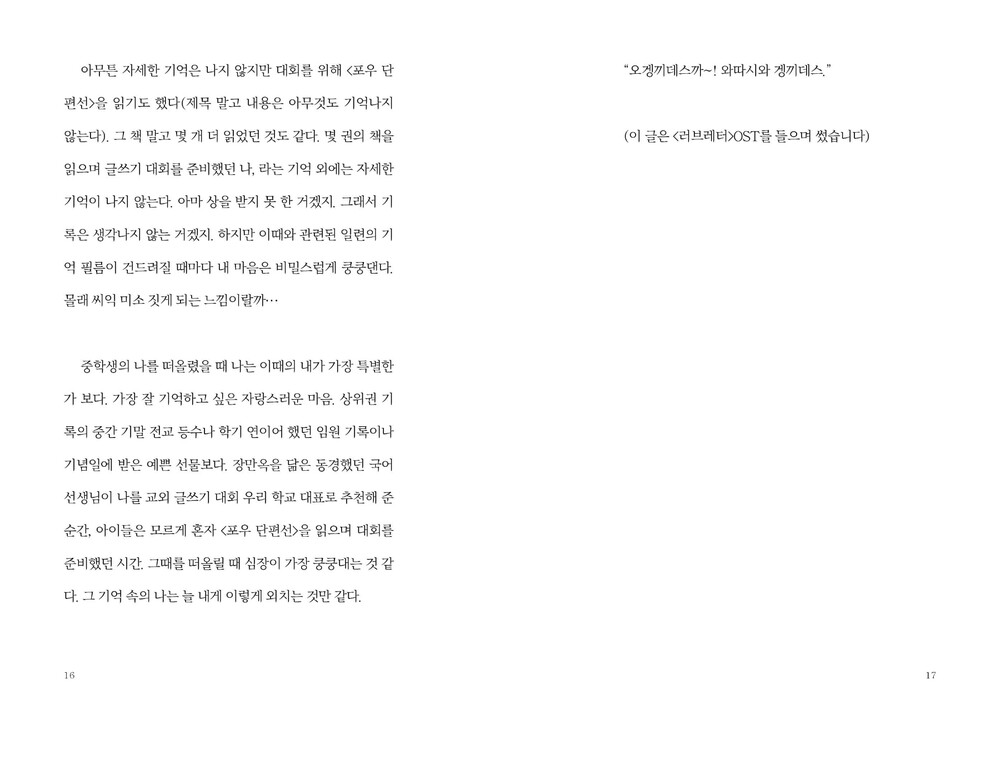 열다섯의 나에겐 어떻게 지내는 게 잘 지내는 거였을까. 그때의 나는 수행평가나 중간 기말고사 점수를 잘 받고 싶은 욕심이 가득 찬 애였다. 초콜릿이나 사탕, 빼빼로, 양말 같은 걸 주고받는 매달 14일의 기념일이나 사귄 지 22일째 되는 투투기념일에 때맞춰 알맞은 것을 받기를 꽤 바랐던 애였다. 그런 것들은 모두가 확인하기 쉬운 티 나는 것들이었지. 그렇지만 어쩐지 떠올릴 때마다 특별한 감정과 이어지는 건 이런 기억이 아니다. 멋쩍게 귀여운 기억 정도쯤 되어도 마음속에 특별함으로 간직되기엔 모자란 기억일 뿐이다. - p14 오겡끼데스까 와따시와 겡끼데스 中