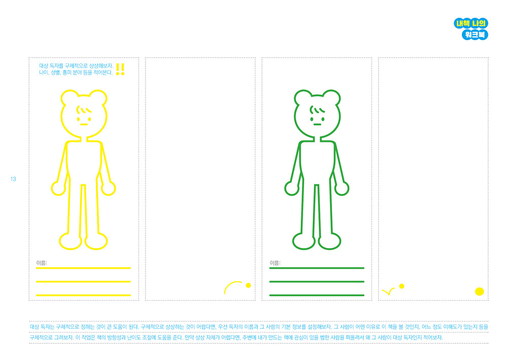 구체적인 아이디어가 있다면, 워크북을 통하여 최초의 의도가 잘 전달되도록 책을 만들고 있는지 점검해 보세요.