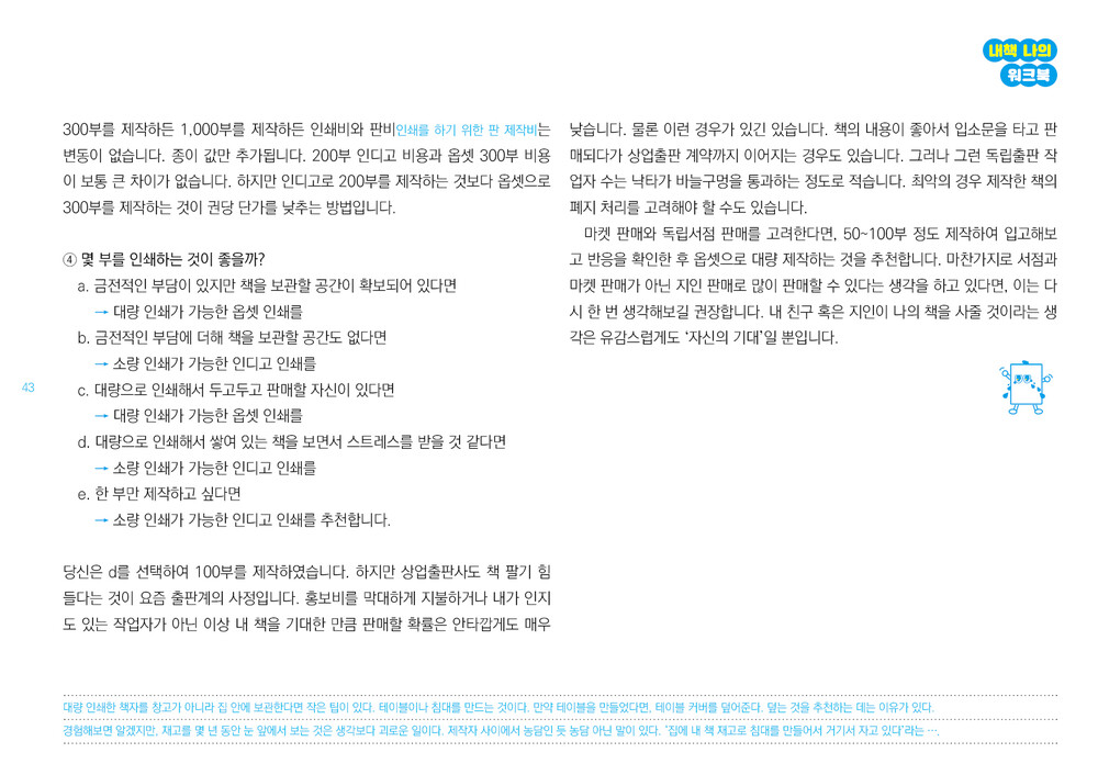 당신은 d를 선택하여 100부를 제작하였습니다. 하지만 상업출판사도 책 팔기 힘들다는 것이 요즘 출판계의 사정입니다. 홍보비를 막대하게 지불하거나 내가 인지도 있는 작업자가 아닌 이상 내 책을 기대한 만큼 판매 할 확률은 안타깝게도 매우 낮습니다. 물론 이런 경우가 있긴 있습니다. 책의 내용이 좋아서 입소문을 타고 판매되다가 상업출판 계약까지 이어지는 경우도 있습니다. 그러나 그런 독립출판 작업자 수는 낙타가 바늘 구멍을 통과하는 정도로 적습니다. 최악의 경우 제작한 책의 폐지 처리를 고려해야 할 수도 있습니다. 마켓 판매와 독립서점 판매를 고려한다면, 50~100부 정도 제작하여 입고해보고 반응을 확인한 후 옵셋으로 대량 제작하는 것을 추천합니다. 마찬가지로 서점과 마켓 판매가 아닌 지인 판매로 많이 판매할 수 있다는 생각을 하고 있다면, 이는 다시 한 번 생각해보길 권장합니다. 내 친구 혹은 지인이 나의 책을 사줄 것이라는 생각은 유감스럽게도 ‘자신의 기대’일 뿐입니다. -43p