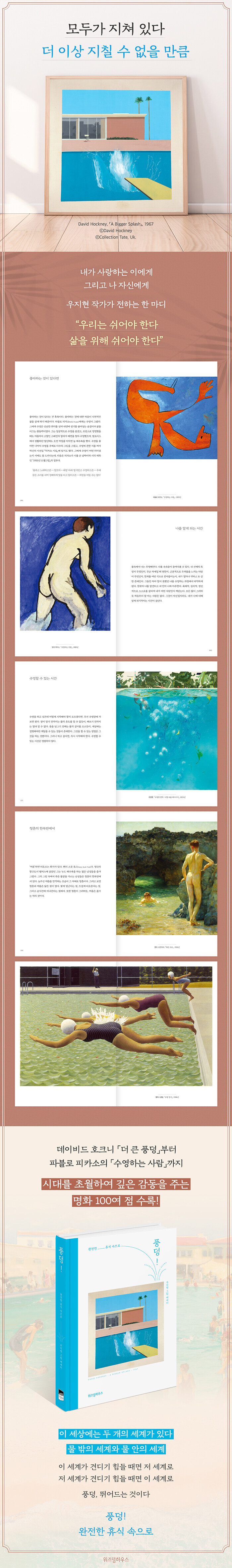 작가는 이 책에서 “모두가 지쳐 있다.”라고 말하며 “내가 사랑하는 이에게, 나 자신에게, 그리고 모든 독자들에게.” “쉬어야 한다. 삶을 위해 쉬어야 한다.”라는 메시지를 전한다. 담담하면서도 서정적인 사유가 돋보이는 우지현 작가의 글과 보기만 해도 시원해지는 100여 점의 다채로운 회화를 감상하며 완전한 휴식 속으로 “풍덩!” 뛰어들 수 있을 것이다.