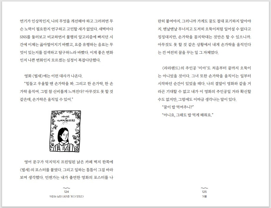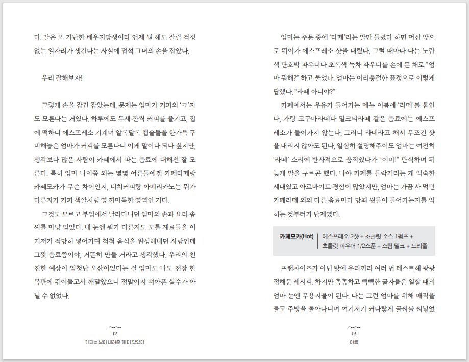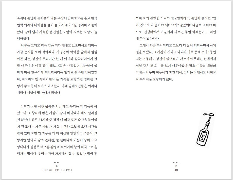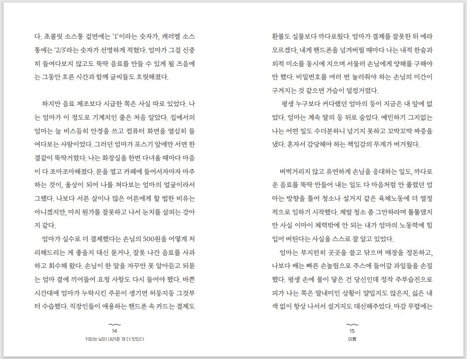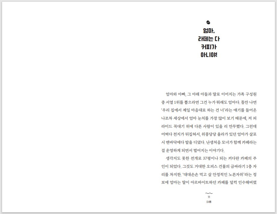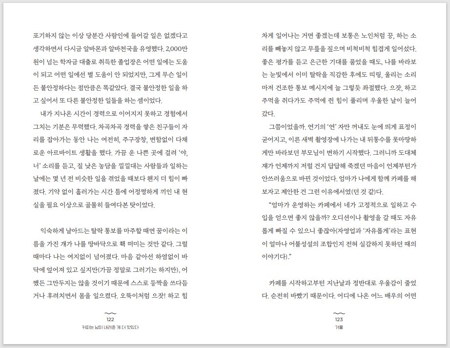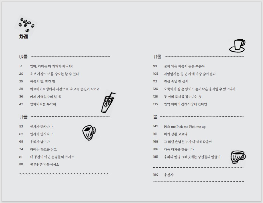 저자의 직업은 배우입니다. 이름난 배우는 아니어서 스스로를 배우 ‘지망생’으로 소개할 때가 더 많습니다. 수없이 오디션에 떨어지며 온갖 아르바이트를 전전하던 중, 이를 보다 못한 엄마의 권유로 함께 카페를 운영하기 시작했어요. 한순간에 아르바이트생에서 사장으로 진급해버린 딸과 뭐가 뭔지 하나도 모르겠는 카페 초심자 엄마가 덜컥 손을 잡았습니다. 초보 자영업자의 희로애락이 담긴 사계절을 펼쳐보세요. 우당탕탕 굴러가는 노동의 현장을 ‘창업기 – 운영기 – 폐업기’로 나누어 담았습니다. 역시 커피는 남이 내려준 게 더 맛있다니까요. 짜고 달고 고소하고 씁쓸하고 때로는 매운 밥벌이의 맛. 초짜 커피팔이 모녀의 사계절 일상 에세이입니다.