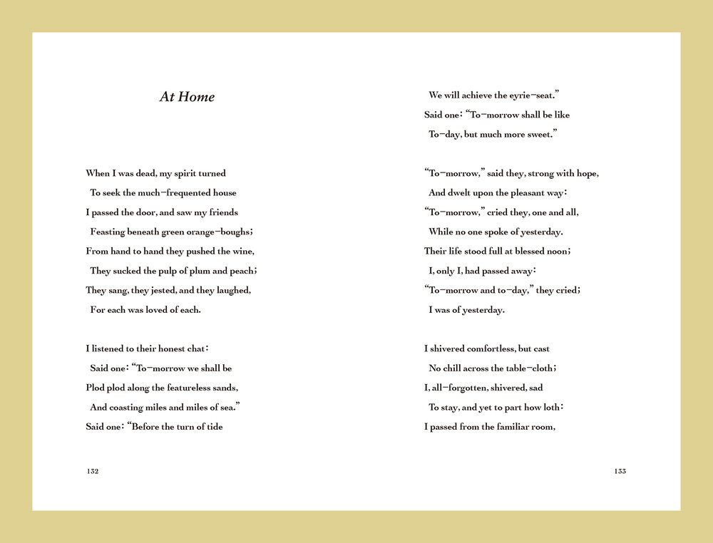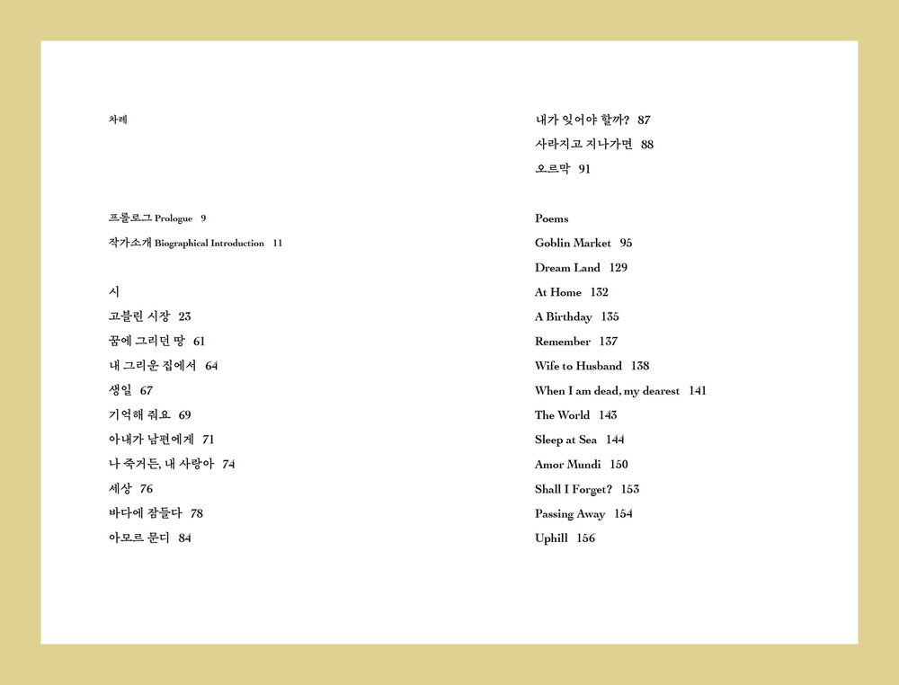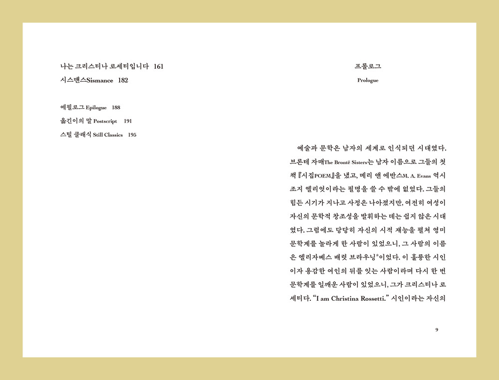 예술과 문학은 남자의 세계로 인식되던 시대. 브론테 자매(The Brontë Sisters)는 남자 이름으로 그들의 첫 책 「시집(Poem)」을 냈고, 메리 앤 에반스(M. A. Evans) 역시 조지 엘리엇이라는 필명을 쓸 수 밖에 없었습니다. 그들의 힘든 시기가 지나고 사정은 나아졌지만, 여전히 여성이 자신의 문학적 창조성을 발휘하는 데는 쉽지 않은 시대였습니다. 그럼에도 당당히 자신의 시적 재능을 펼쳐 영미 문학계를 놀라게 한 사람이 있었으니, 그 사람의 이름은 엘리자베스 배럿 브라우닝이었습니다. 이 훌륭한 시인이자 용감한 여인의 뒤를 잇는 사람이라며 다시 한 번 문학계를 일깨운 사람이 있었으니, 그가 크리스티나 로세티입니다.