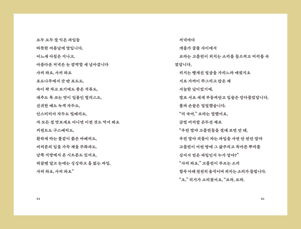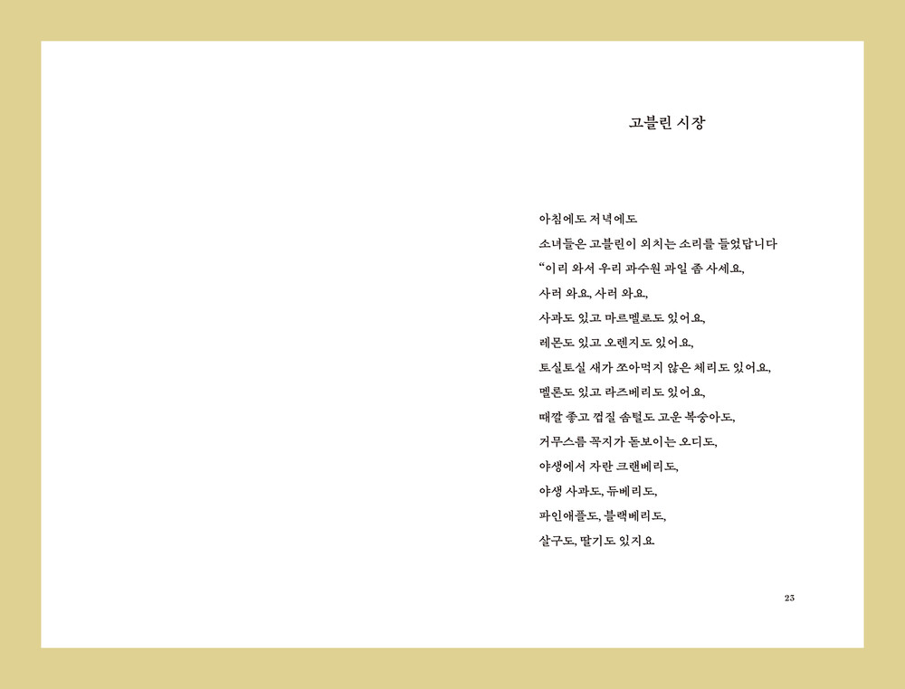 크리스티나 로세티는 낭만주의 시, 어린이를 위한 시, 종교 시 등을 남긴 잉글랜드 작가입니다. 환상 동화를 연상케 하는 시 <고블린 시장>(1862)과 <왕자의 순례>(1866) 등의 작품으로 명성을 얻은 시인입니다. 삶과 신앙에 관한 생각과 고민을 탁월한 시적 감수성으로 풀어냈지요. 시간이 지나면서 종교 산문이나 소설 창작에도 힘썼습니다. 영국에서 잘 알려진 두 곡의 크리스마스 캐럴 <In the Bleak Midwinter>와 <Love Came Down at Christmas>의 가사를 쓴 것도 크리스티나입니다. 라파엘 전파(Raphael前派)의 핵심 인물로 화가이자 시인인 단테이 게이브리얼 로세티(Dante Gabriel)는 그녀의 오빠이기도 합니다. 크리스티나의 시는 버지니아 울프, 제라드 맨리 홉킨스 등과 같은 작가에게 큰 영향을 주게 됩니다.