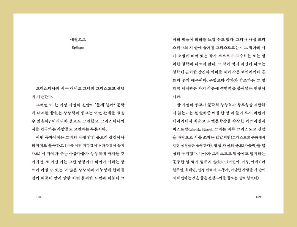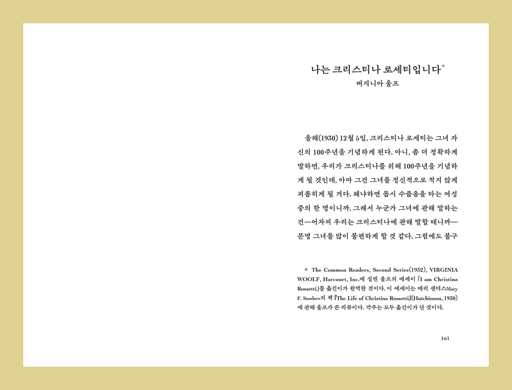 시인이라는 자신의 정체성을 당당히 드러낸 크리스티나의 이 선언을 소개한 버지니아 울프 또한 우리를 그녀에게로,
