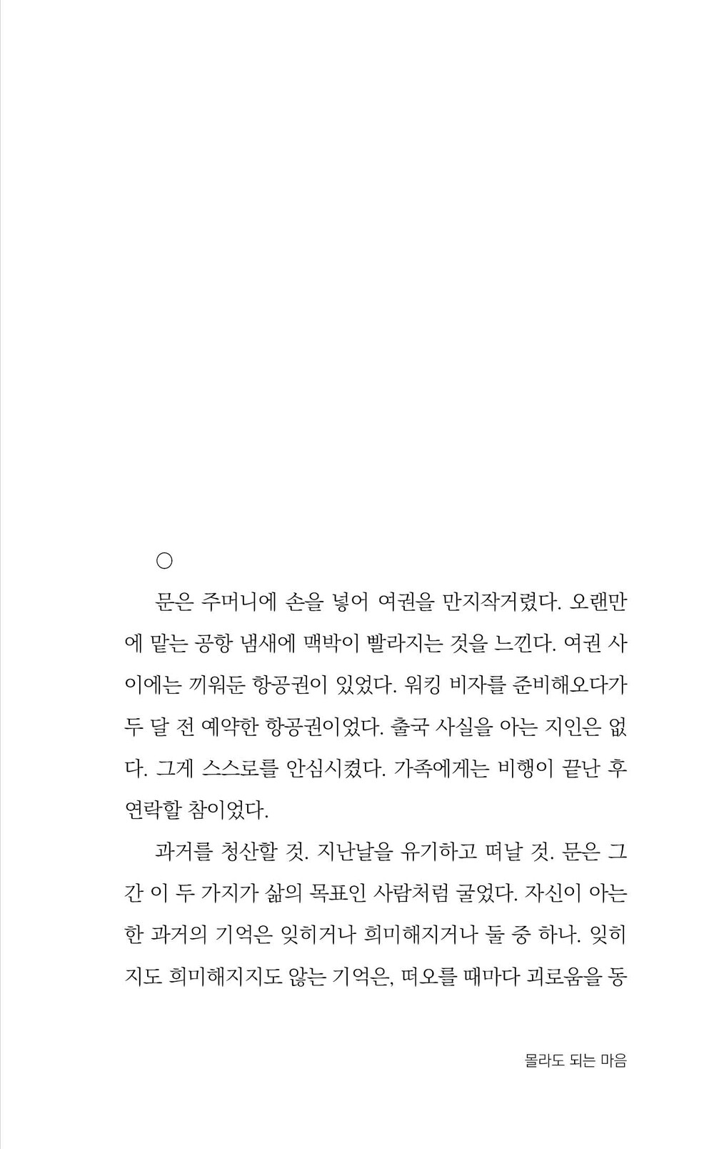 과거를 청산할 것. 지난날을 유기하고 떠날 것. 문은 그간 이 두 가지가 삶의 목표인 사람처럼 굴었다. 자신이 아는 한 과거의 기억은 잊히거나 희미해지거나 둘 중 하나. 잊히지도 희미해지지도 않는 기억은, 떠오를 때마다 괴로움을 동반하는 기억은, 제발 버려버리는 수밖에 없지 않나. 내 일이아닌 척, 나에게 그런 일은 없었던 척 살아볼 수 있지 않나. 기억이 되살아나는 걸 유예시켜볼 수 있지 않나.