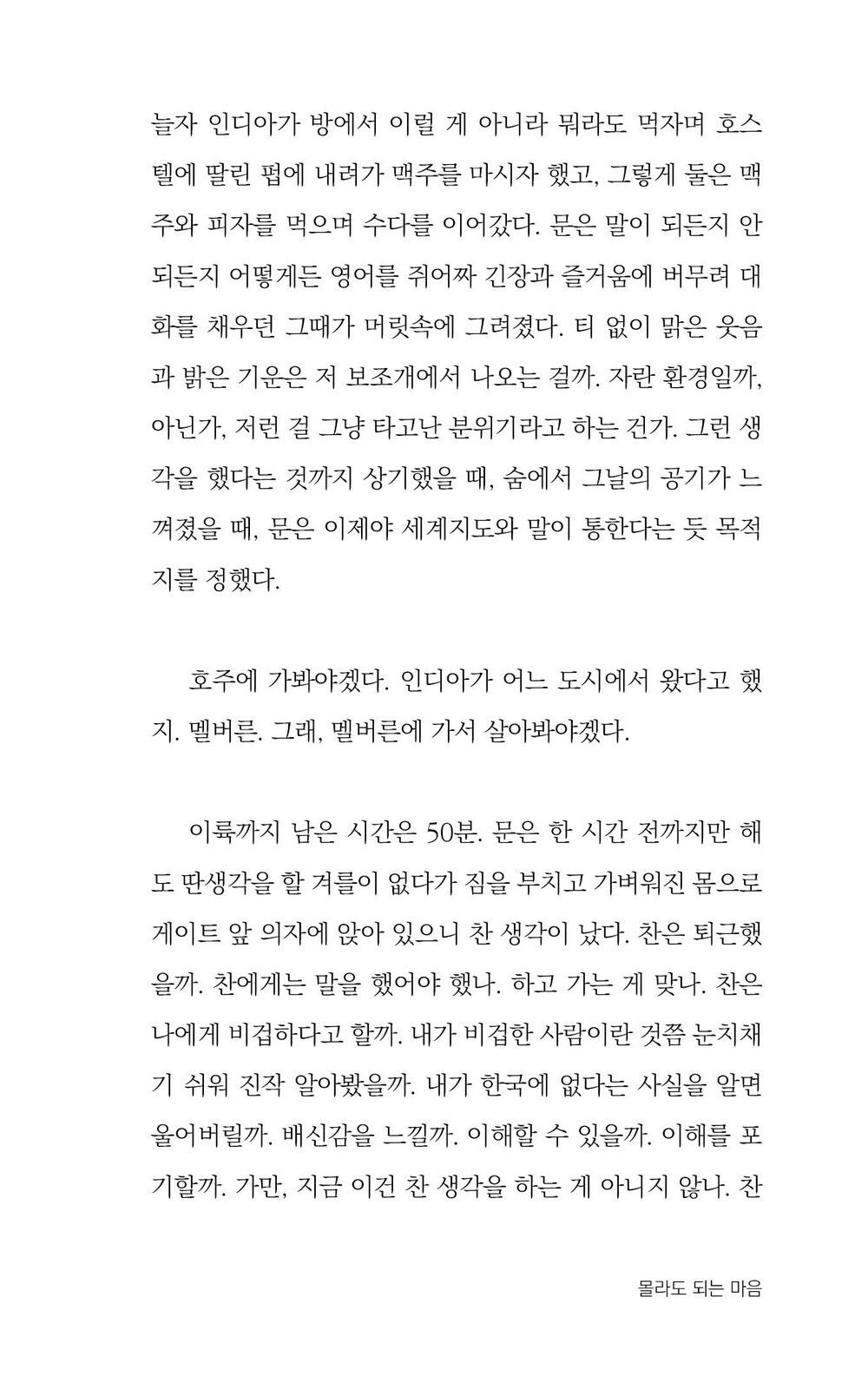 문은 주머니에 손을 넣어 여권을 만지작거렸다. 오랜만에 맡는 공항 냄새에 맥박이 빨라지는 것을 느낀다. 여권 사이에는 끼워둔 항공권이 있었다. 워킹 비자를 준비해오다가 두 달 전 예약한 항공권이었다. 출국 사실을 아는 지인은 없다. 그게 스스로를 안심시켰다. 가족에게는 비행이 끝난 후 연락할 참이었다.