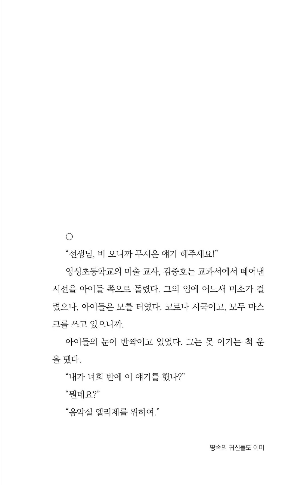 영성초등학교의 미술 교사, 김중호는 교과서에서 떼어낸 시선을 아이들 쪽으로 돌렸다. 그의 입에 어느새 미소가 걸렸으나, 아이들은 모를 터였다. 코로나 시국이고, 모두 마스크를 쓰고 있으니까.