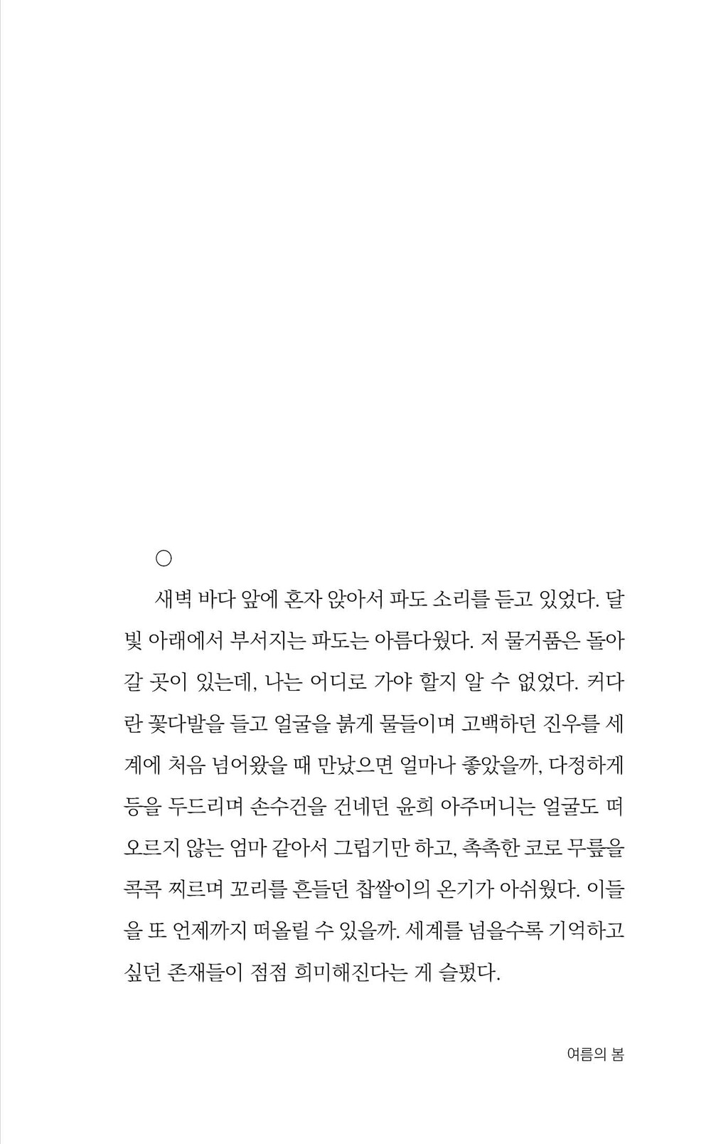 새벽 바다 앞에 혼자 앉아서 파도 소리를 듣고 있었다. 달빛 아래에서 부서지는 파도는 아름다웠다. 저 물거품은 돌아갈 곳이 있는데, 나는 어디로 가야 할지 알 수 없었다. 커다란 꽃다발을 들고 얼굴을 붉게 물들이며 고백하던 진우를 세계에 처음 넘어왔을 때 만났으면 얼마나 좋았을까, 다정하게등을 두드리며 손수건을 건네던 윤희 아주머니는 얼굴도 떠오르지 않는 엄마 같아서 그립기만 하고, 촉촉한 코로 무릎을 콕콕 찌르며 꼬리를 흔들던 찹쌀이의 온기가 아쉬웠다. 이들을 또 언제까지 떠올릴 수 있을까. 세계를 넘을수록 기억하고 싶던 존재들이 점점 희미해진다는 게 슬펐다.