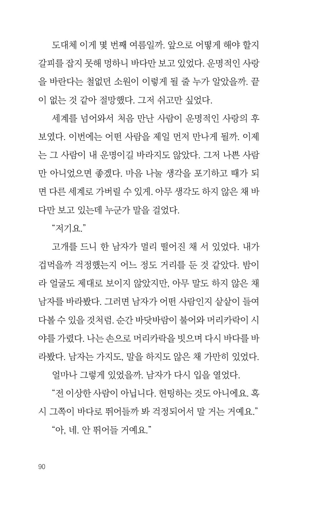 세계를 넘어와서 처음 만난 사람이 운명적인 사랑의 후보였다. 이번에는 어떤 사람을 제일 먼저 만나게 될까. 이제는 그 사람이 내 운명이길 바라지도 않았다. 그저 나쁜 사람만 아니었으면 좋겠다. 마음 나눌 생각을 포기하고 때가 되면 다른 세계로 가버릴 수 있게. 아무 생각도 하지 않은 채 바다만 보고 있는데 누군가 말을 걸었다.