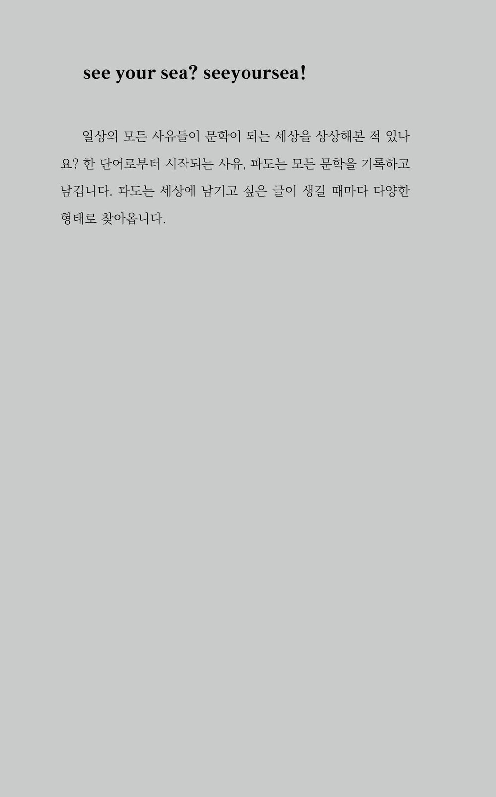 일상의 모든 사유들이 문학이 되는 세상을 상상해본 적 있나요? 한 단어로부터 시작되는 사유, 파도는 모든 문학을 기록하고 남깁니다. 파도는 세상에 남기고 싶은 글이 생길 때마다 다양한 형태로 찾아옵니다.