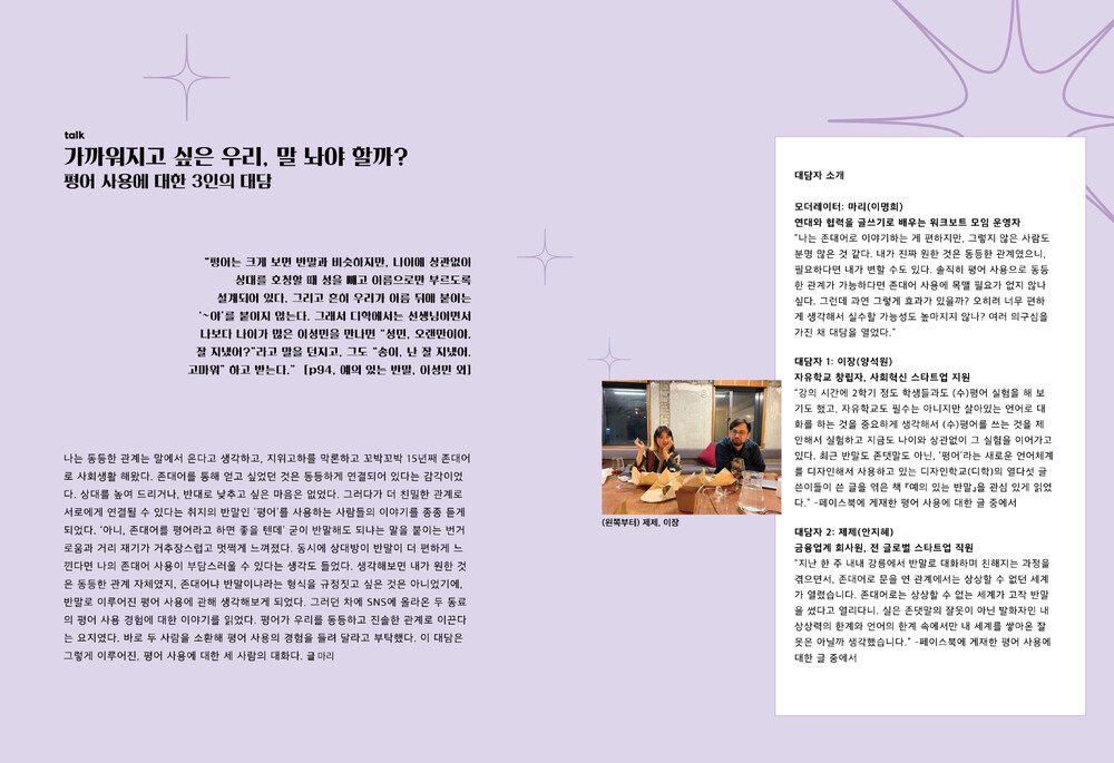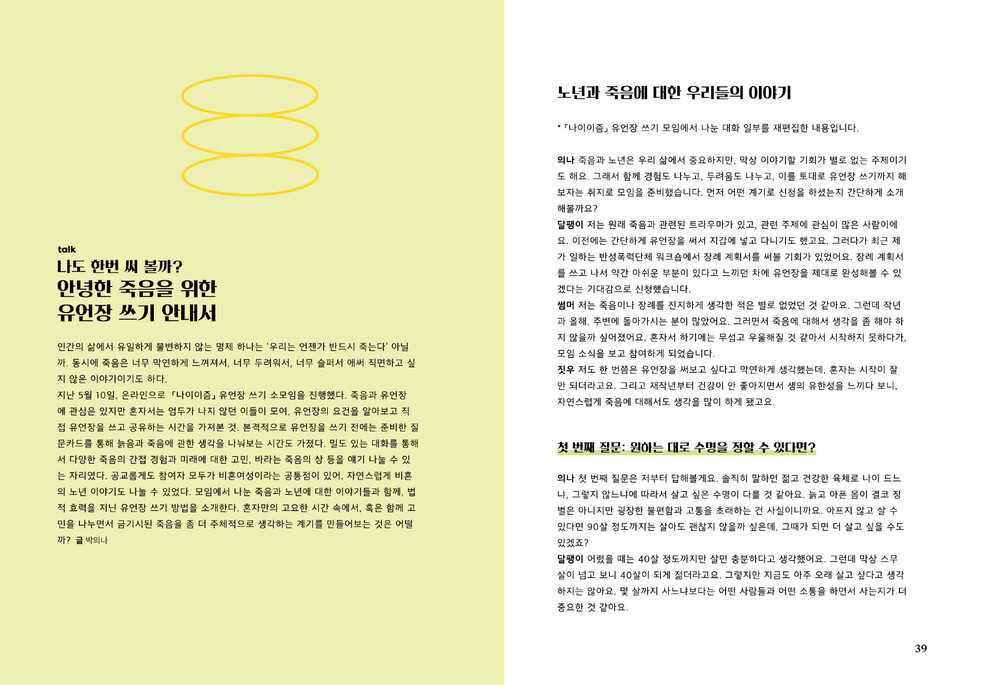 나이이즘 4호에는 나이이즘의 기본 정체성인 나이 문화와 에이지즘에 대한 고민과 질문들도 담겨 있습니다. 위계를 없애고 수평적인 소통을 지향하는 평어 사용에 대한 대담부터 지나친 영어 사용으로 노년을 배제하는 문화, 미래와 죽음을 상상해보면서 나의 유언장을 써보는 활동까지…. 나이 듦과 세대 문화, 에이지즘을 키워드로 한 다양한 질문과 고민을 매거진 곳곳에 녹여 냈습니다.
