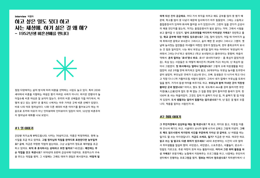 10대부터 70대까지, 다양한 세대 비혼의 이야기와 생각은 물론 비혼이 받는 정책적 차별에 대한 생각과 성소수자 비혼으로 나이 들어가는 일, 이혼을 통해 다시 비혼이 된 이야기까지… 다양한 비혼 이야기를 만날 수 있습니다.