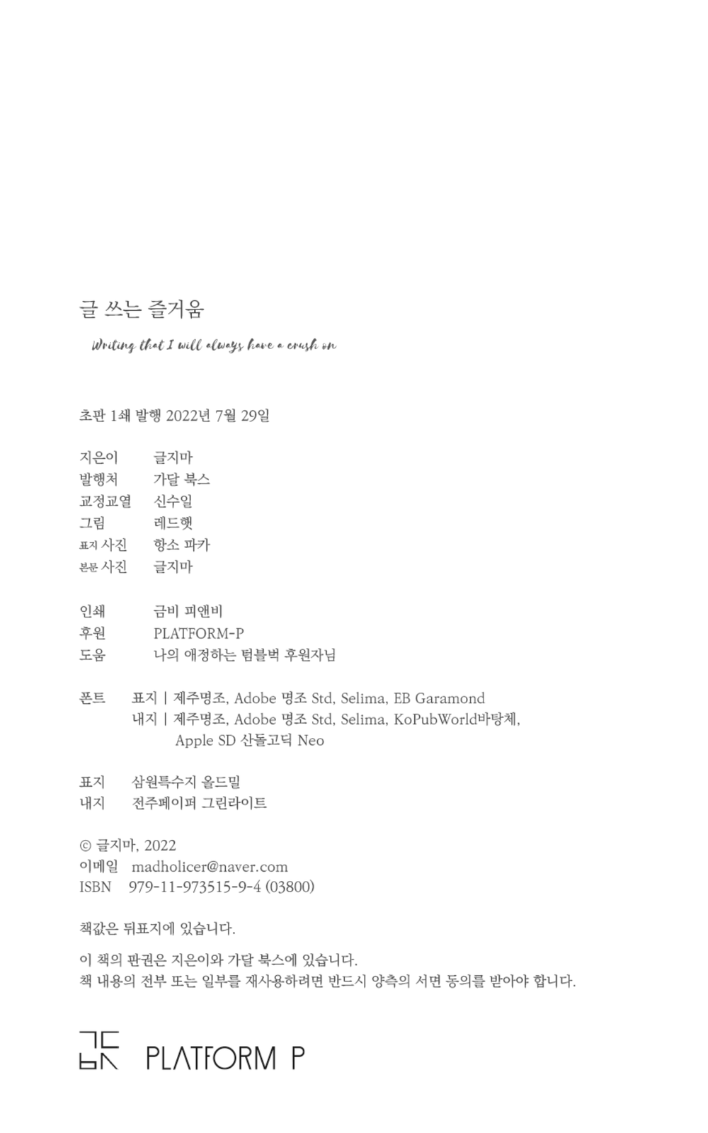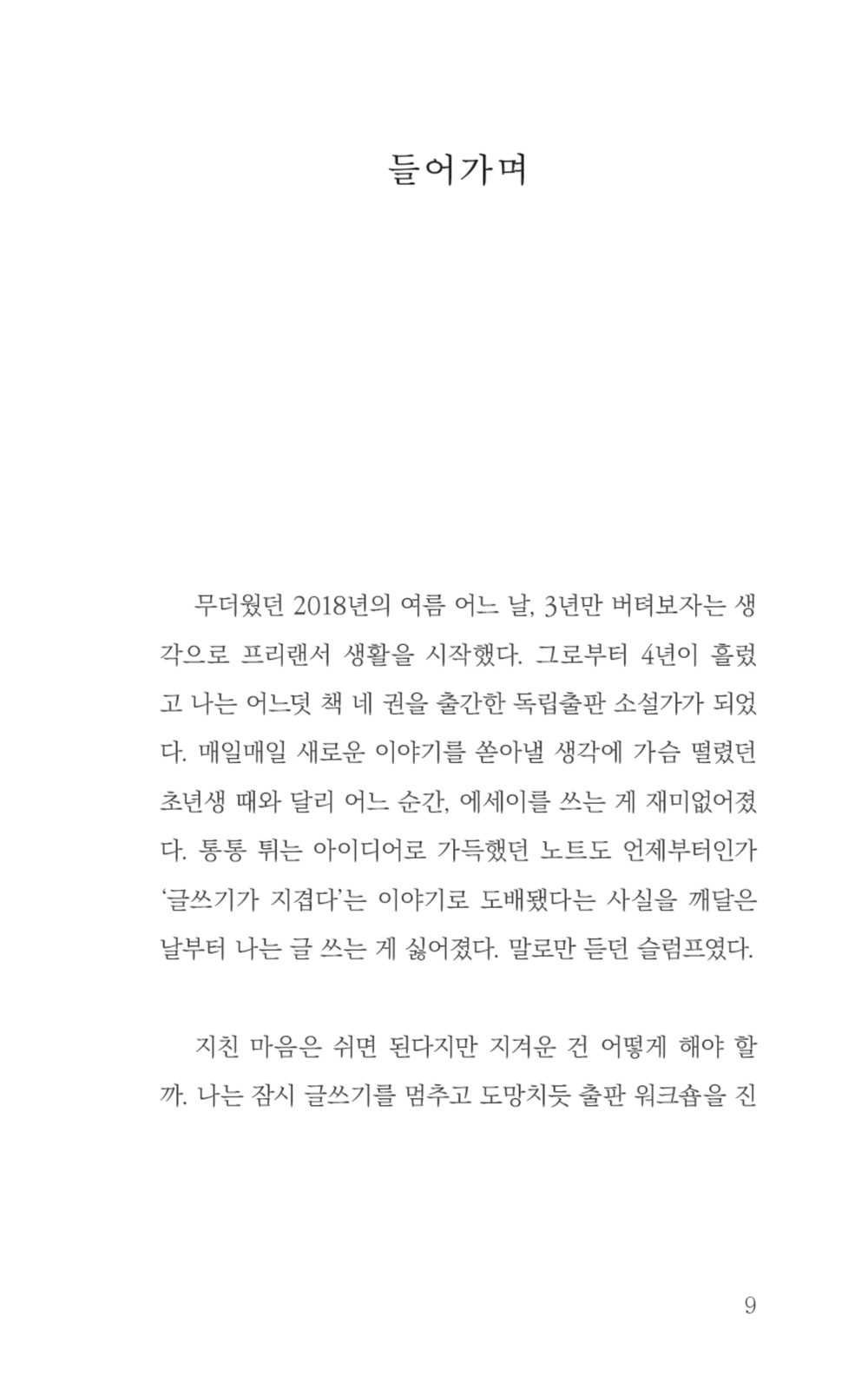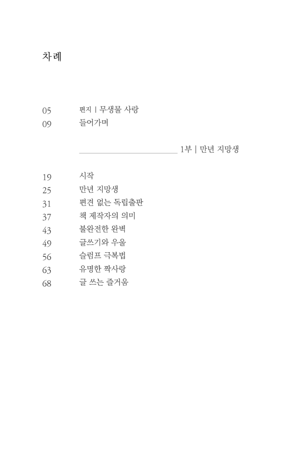 시작 ⎢ 만년 지망생 ⎢ 편견 없는 독립출판 ⎢ 책 제작자의 의미 ⎢ 불완전한 완벽 ⎢ 글쓰기와 우울 ⎢ 슬럼프 극복법 ⎢ 유명한 짝사랑 ⎢ 글 쓰는 즐거움