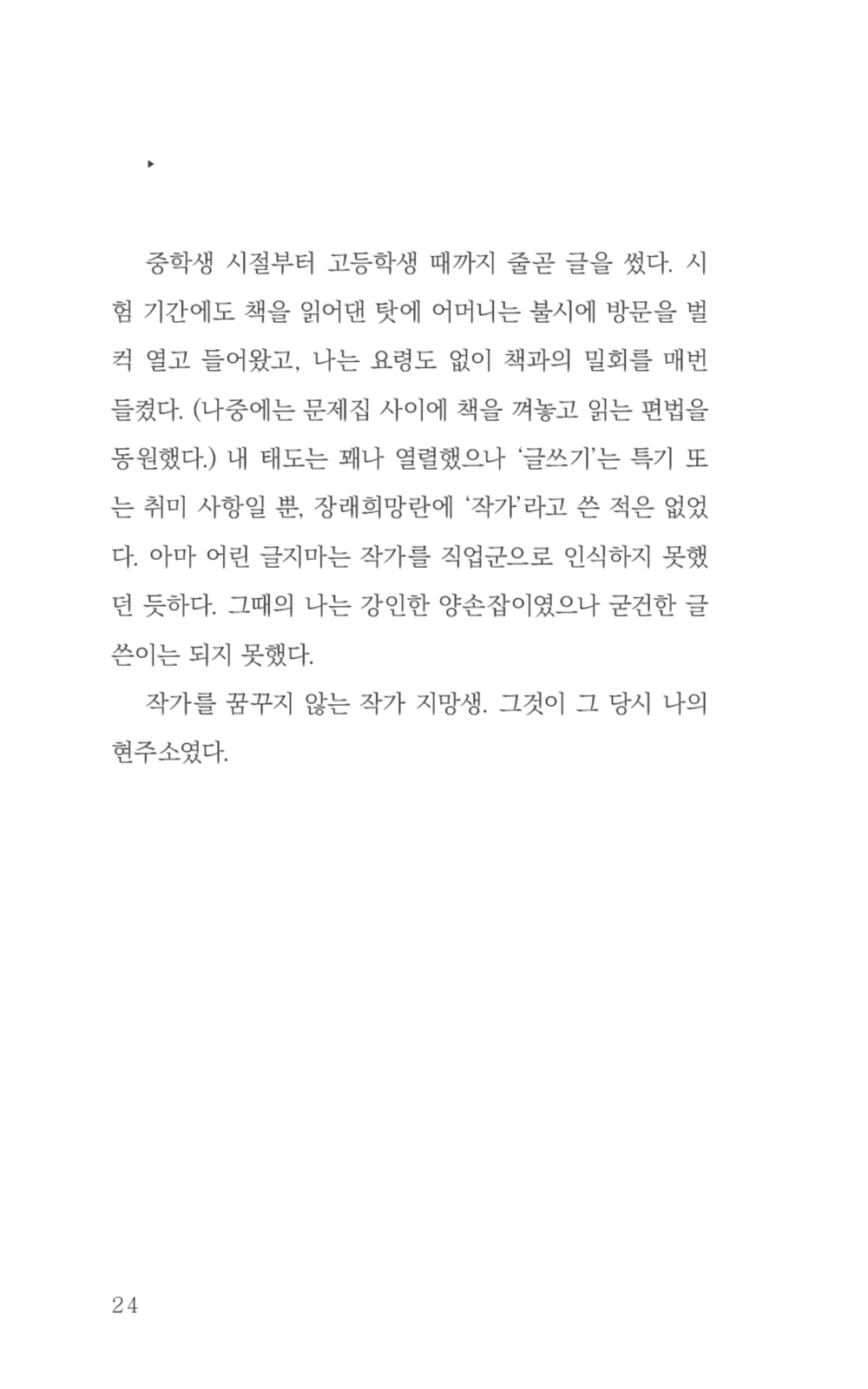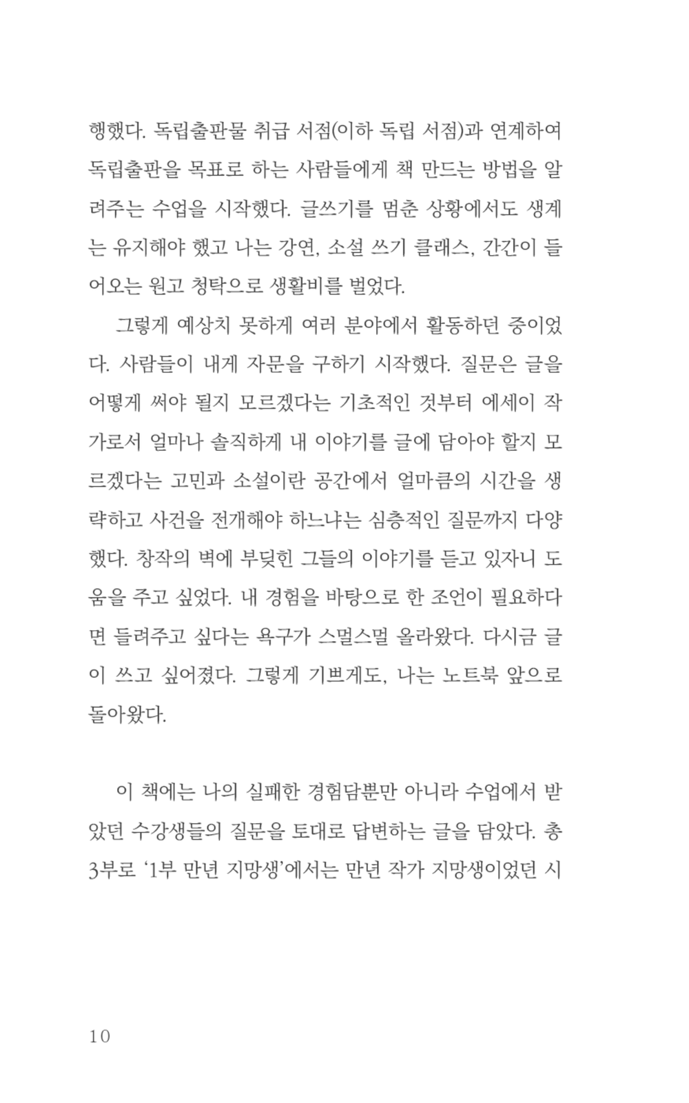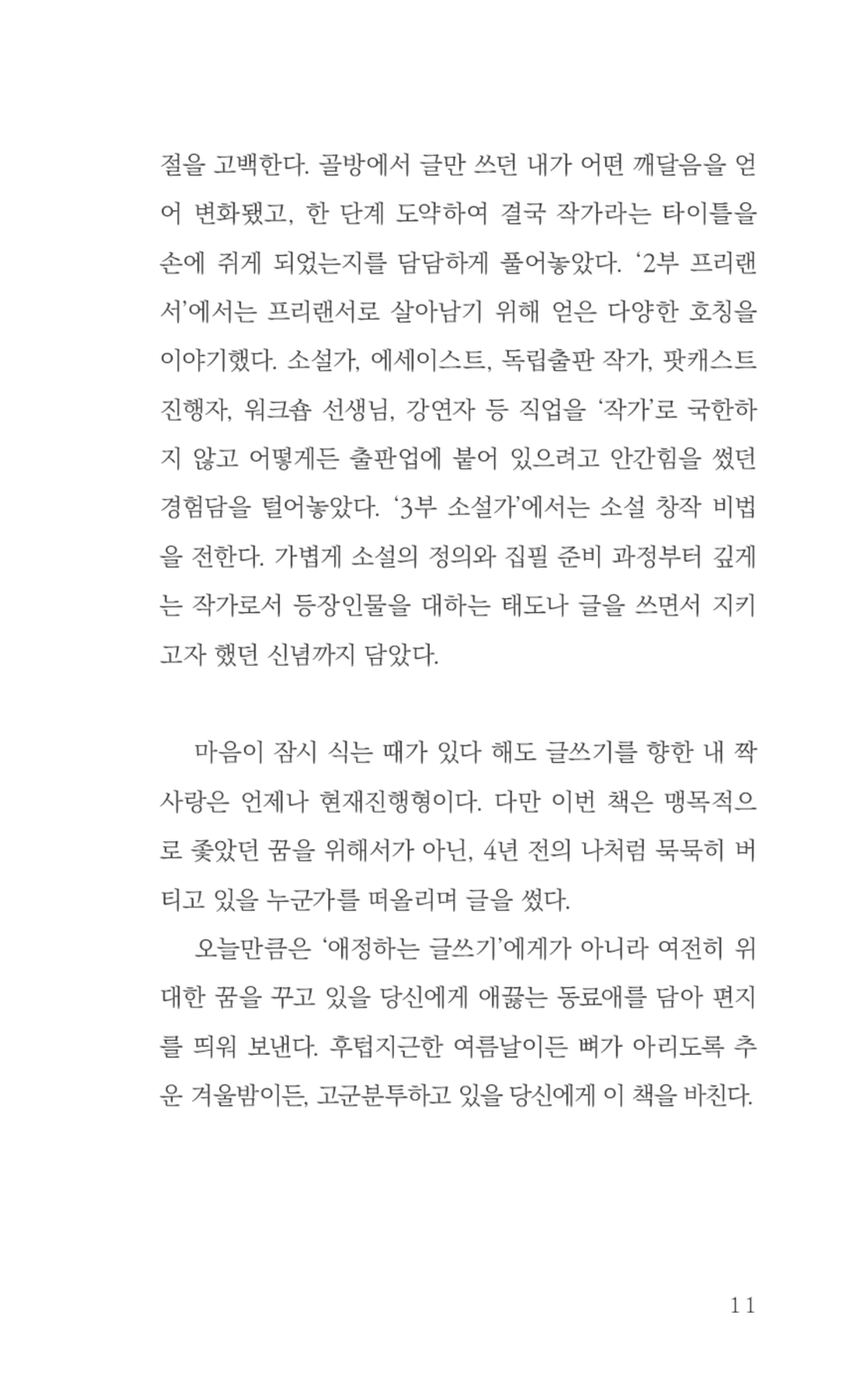 이 책은 총 3부로 '1부 만년 지망생'에서는 만년 작가 지망생이었던 시절을 이야기한다. 글지마 작가는 자신이 '글을 써야만 한다고 착각한 덕분'에 지금까지 글을 쓸 수 있었다고 말한다. 꿈을 포기할 시점을 놓쳐 여기까지 왔다는 그의 담담한 고백은 오히려 꿈의 갈림길에 선 이들에게 포기하지 않아도 괜찮다는 희망으로 비춰진다.
