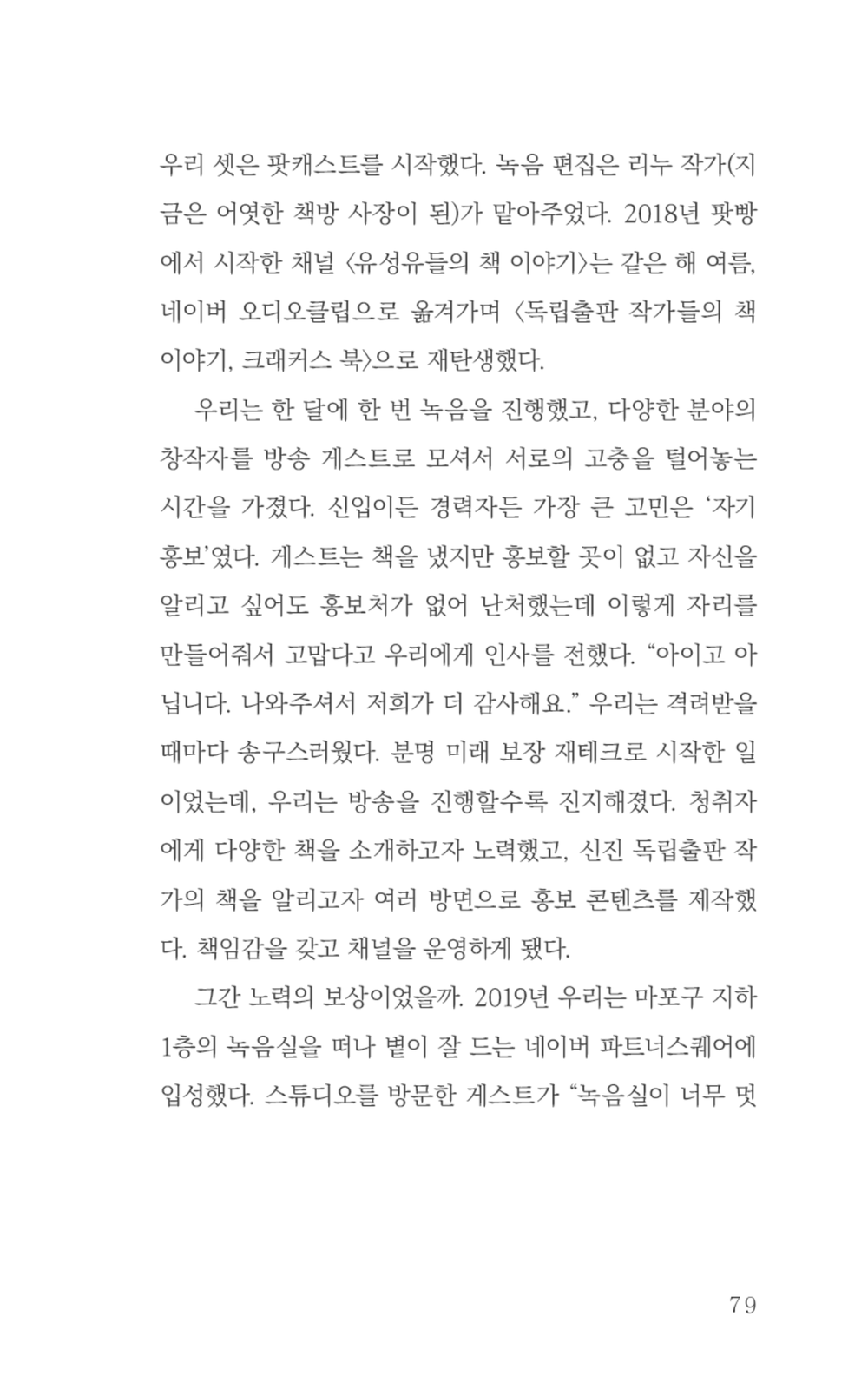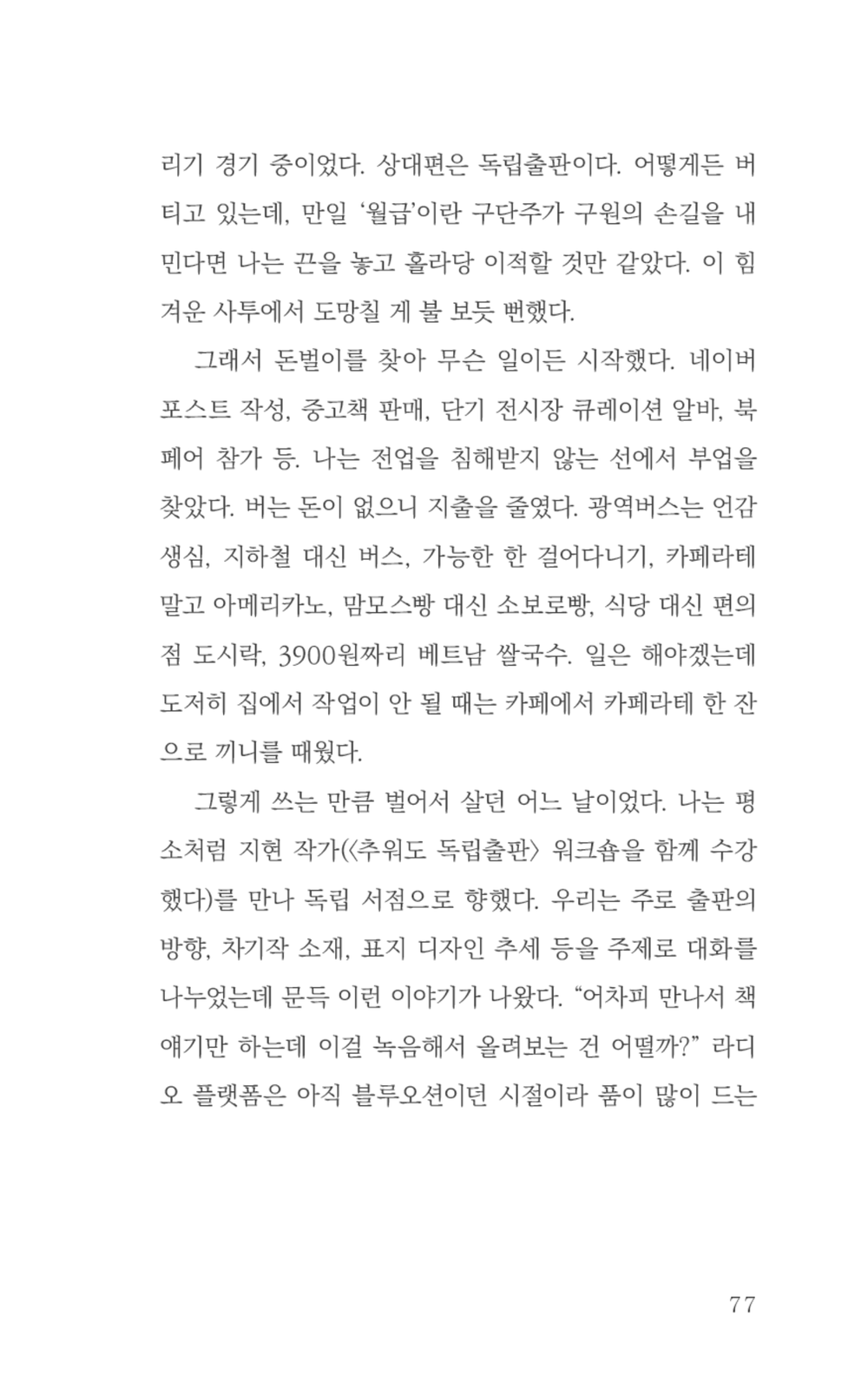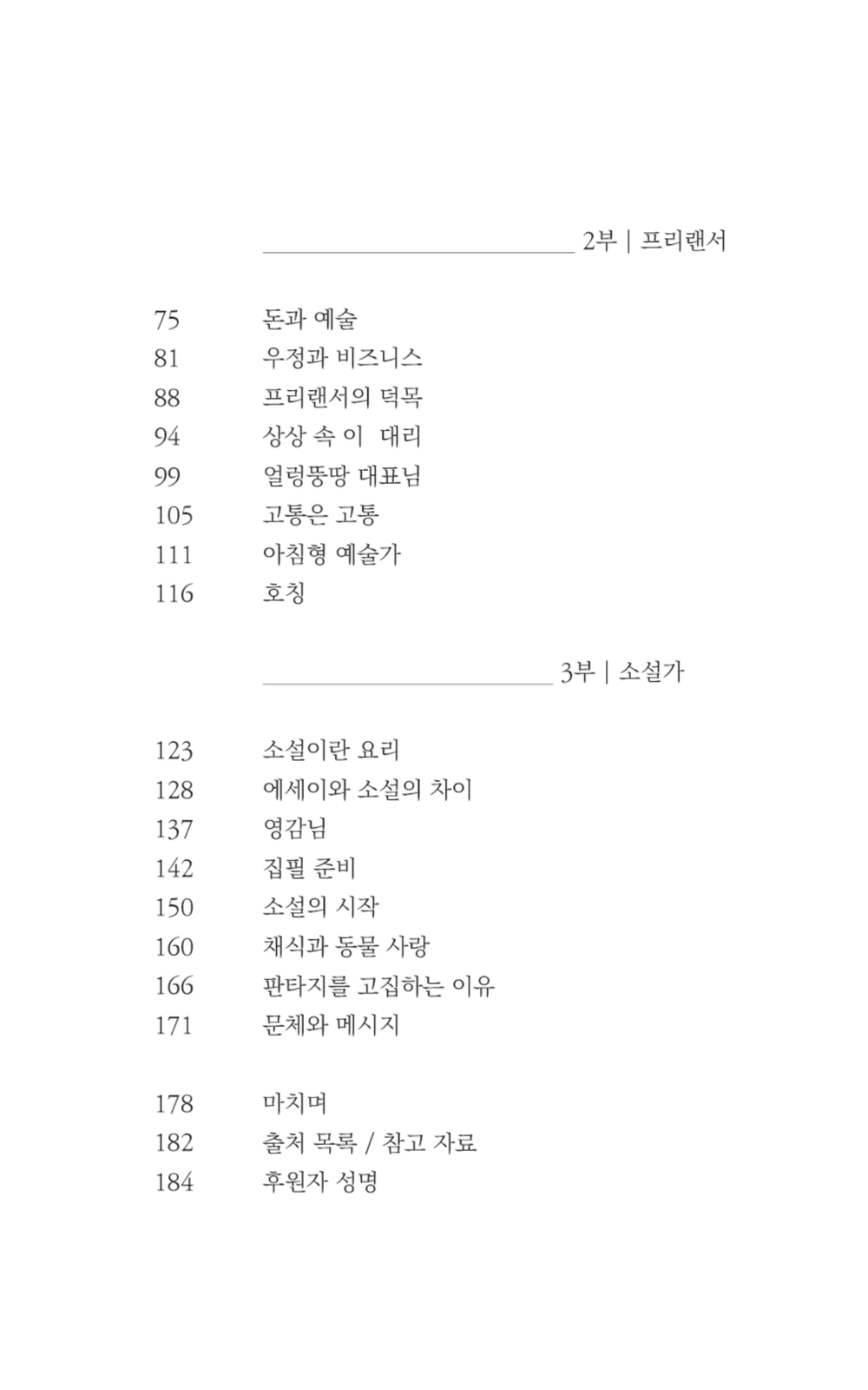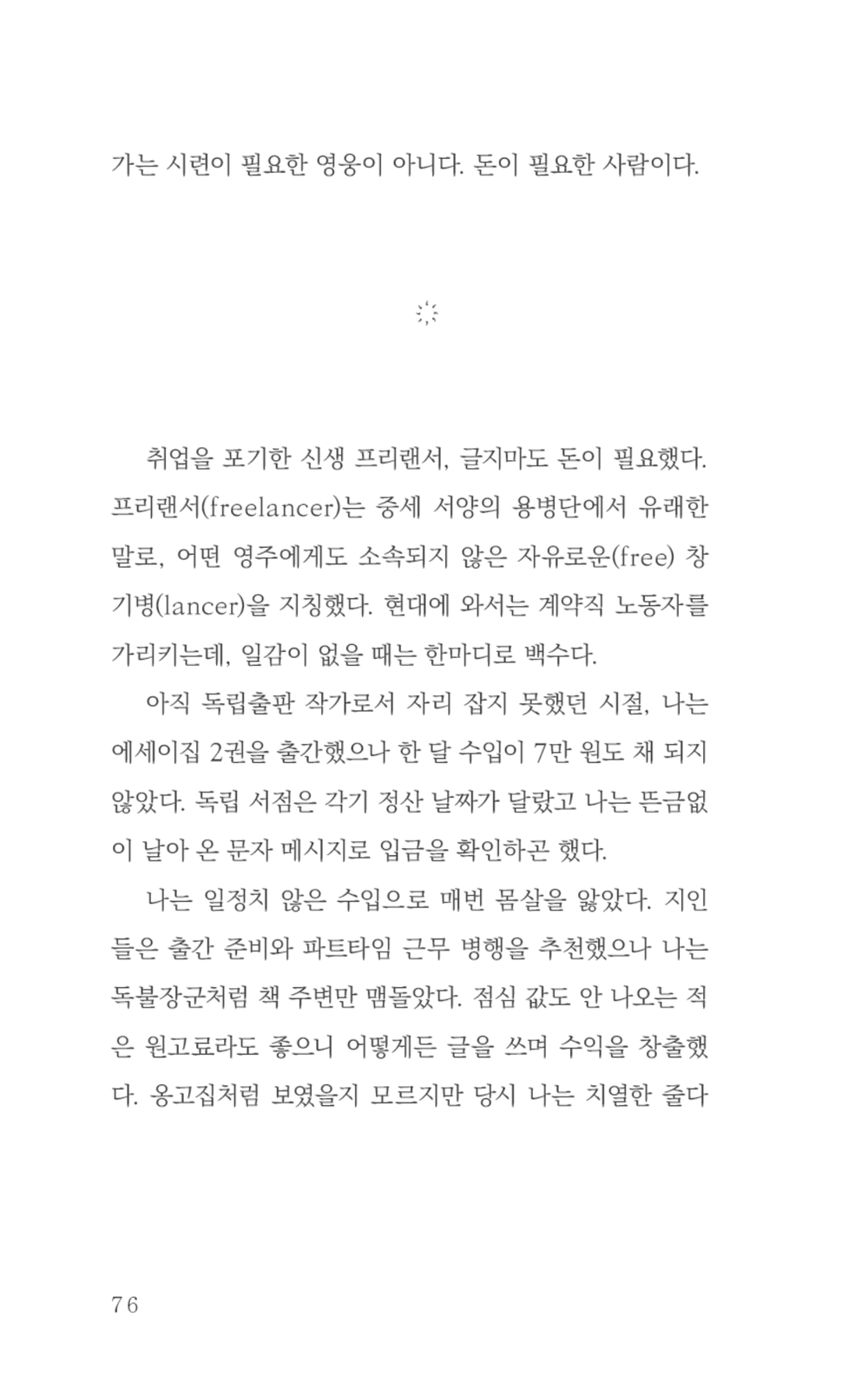 저자는 '2부 프리랜서'에서 프리랜서로 살아남고자 얻은 다양한 호칭을 언급한다. 소설가, 에세이스트, 독립출판 작가, 팟캐스트 진행자, 워크숍 선생님, 강연자 등 직업을 '작가'로 국한하지 않는 유연한 사고방식으로 어떻게 경제적 빈곤을 해결했는지 풀어놓는다.
