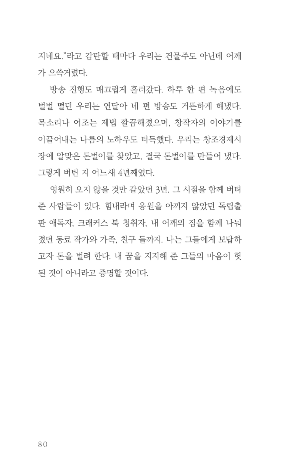 최선을 다했음에도 꿈을 이루지 못했다면 또다시 도전하는 게 맞을까, 아니면 비루 한 재능을 탓하며 그만두는 게 현명한 처신일까. 그 해답을 찾고자 누군가는 버티고 누군가는 포기한다. 지망생 생활에도 정년퇴직이 있다면 편했을 텐데, 나는 그 생활을 언제 마쳐야 하는지 몰라서 여기까지 왔다.(…)