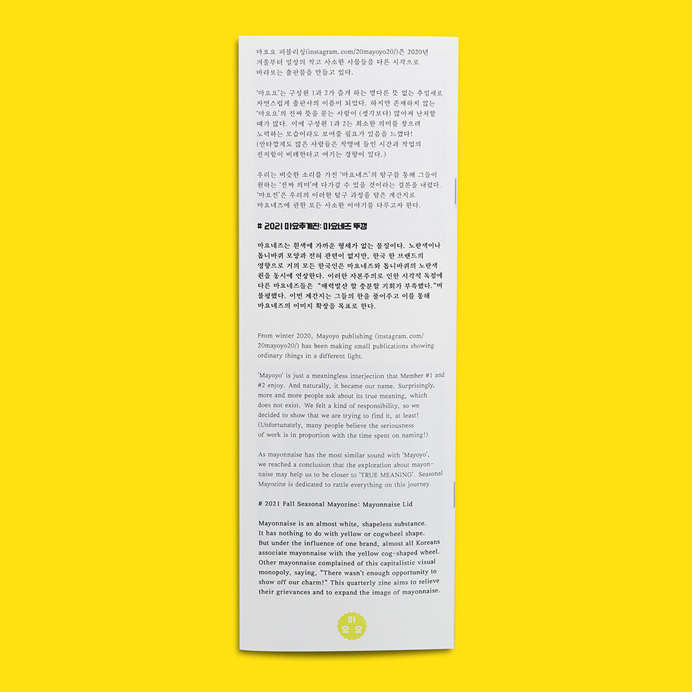 마요요 퍼블리싱은 2020년 겨울부터 일상의 작고 사소한 사물들을 다른 시각으로 바라보는 출판물을 만들고 있다. 출판사명인 '마요요'와 비슷한 소리를 가진 ‘마요네즈’의 탐구를 통해 별 뜻 없는 ‘마요요’에 다가갈 수 있을 것이라는 결론을 내렸다. ‘마요진’은 우리의 이러한 탐구 과정을 담은 계간지로 마요네즈에 관한 모든 사소한 이야기를 다루고자 한다.